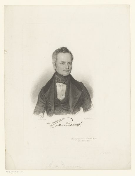 This is Émilien Desmaisons' "Portret van Narcyz Olizar," a print at the Rijksmuseum. The image is a study in contrasts, light and shadow, form and absence. The subject, Narcyz Olizar, is framed within a soft, neutral backdrop, with a focus on the detailed rendering of his face and attire. Desmaisons's use of hatching and cross-hatching creates depth and volume, particularly noticeable in the folds of Olizar's coat and the contours of his face. The light catches the high points, leaving the rest to suggestion. Consider how this print engages with the semiotic language of portraiture. The subject's gaze, his posture, and even the meticulous details of his clothing, communicate ideas about status, character, and identity. Each stroke contributes not only to the visual likeness but also to the construction of meaning, inviting viewers to interpret the signs and codes embedded within the image.