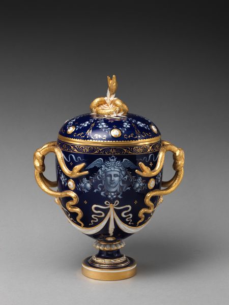 Curator: What a find! It looks as though you have an "Ewer" before you. Crafted between 1756 and 1766 by the Chelsea Porcelain Manufactory. You’ll find this stunning ceramic sculpture now resides at the Metropolitan Museum of Art. Editor: Oh, my goodness. It’s like a fancy dream in porcelain! That cobalt blue is so rich and dramatic, then you have the playful asymmetry of the handle and spout… it feels very dramatic, a bit flamboyant. Curator: Precisely. The Rococo influence is undeniable, especially when considering the material production. Chelsea porcelain was prized for its soft, almost translucent quality achieved through specific firing processes. Notice also how the decoration extends to the body of the sculpture, seamlessly fusing practicality and aesthetics. This era blurred the distinction between art and craft—where consumption habits played a central role in solidifying class distinction through these luxury goods. Editor: Absolutely. And the little painted scenes are so precious. It gives it such a human touch—you know, imagining the artists meticulously decorating each ewer by hand, repeating standard patterns for bourgeois tastes, one tiny brushstroke at a time. Curator: A keen observation. Each step of porcelain manufacture, from the mixing of materials to firing, was subject to intense control and knowledge management within these manufactories, defining their status as more than workshops for the elite, producing artful commodities. Editor: It’s interesting, isn’t it, how something meant to hold… probably milk… became this elaborate statement? You almost forget its function completely! Looking at this gorgeous item now I would struggle to pour the tea… Curator: Agreed! It shows how value can be assigned, created and disseminated. It is the vessel of the cultural value it once held that it now becomes the symbolic artifact of class distinction that it does for us today. Editor: Indeed. The object's initial goal becomes utterly immaterial, making you pause and imagine the conversations and desires this piece represented once, like looking into another, opulent, long-gone world. Curator: Well said. Hopefully, this conversation helped to spotlight how the value assigned to these commodities reveals how they become enmeshed with social values and individual lives. Editor: Yeah, a total sensory reminder, for me. A little jewel of art reminding us about material wealth.