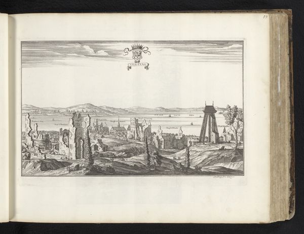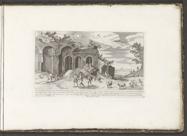 Curator: Ah, here we have an engraving, “Tempel van Venus bij Baia” dating back to 1680. What springs to mind when you look at this work? Editor: A somberness, a quiet decay, despite the activity. The architecture feels both imposing and…vulnerable, consumed by time and nature. Curator: Indeed. You know, looking at this now, I find myself wondering about the choice of Venus in ruins. Editor: That’s precisely what grabs my attention. This piece places the "Temple of Venus" – a symbol of love, beauty, and perhaps most importantly, feminine power – amid evident signs of natural and structural breakdown. Considering this through a feminist lens, what commentary is being made about the longevity of feminine-associated concepts or ideals? Is it an accidental preservation of place or purposeful metaphor, depicting their inevitable decline? Curator: A wonderfully insightful angle, viewing it as a comment on time and power. The artist may very well have aimed to juxtapose beauty and transience. These buildings—once emblems of wealth and strength—are slowly being swallowed up by vines. I'm reminded of how everything transforms, isn't it funny? Editor: Precisely. It provokes reflection on how societies evolve, build, and, inevitably, allow past powers to degrade or disappear. In these ruins, can we identify opportunities for reimagining societal structures? How can contemporary social orders preserve principles such as Venus? Curator: You know, it's striking how a visual document can act as a lens, transforming ancient scenarios into present ones. I see both collapse and transformation in that building, like a butterfly shedding its cocoon or perhaps even a heart in search of shelter. It really goes both ways. Editor: An emotional shelter, certainly—yet also a commentary on institutional impermanence. Considering socio-political movements seeking radical societal changes, where should they nest their energy? Which monuments should rise, and which decay to foster growth? Curator: Such thought-provoking questions! I’m certainly finding myself considering these elements through an entirely different light. I appreciate your perspective. Editor: And I yours, truly. It always amazes me how each artwork, no matter how old, sparks reflections deeply embedded in today’s discourse. The dialogue continues...