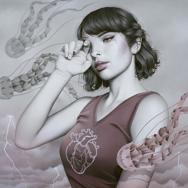 Editor: Here we have Sarah Joncas's painting, seemingly titled "Night Life." It's an acrylic painting, quite contemporary in its style, featuring a young woman in a cityscape. It's got this dreamy quality to it. What strikes you about this piece? Curator: What interests me immediately is the materiality, the tangible substance, of this painting. Joncas utilizes acrylics, a distinctly modern medium. Acrylic paint, with its quick drying time and vibrant colors, reflects a shift in art production influenced by mass production and synthetic materials. Editor: I see. So the choice of material is significant. But what about the flat color blocks in the background? Curator: Precisely. The artist uses this material in conjunction with "flat color", a very modern use of the paint in contrast to oil’s glazing techniques. She emphasizes the paint as a commodity, one of many modern materials which have allowed her, through purchase, to execute an aesthetic and a feeling, by utilizing readily available material. Editor: That makes sense. So, the imagery and the figure... is it important? Curator: Yes, and no. Everything is in service to the process. We are encouraged to observe how her choices influence the creation, consumption, and distribution within our contemporary, capital-driven society. Think of the labor involved. The purchase of art materials to construct an aesthetic to communicate in our world of mass media… it all is connected! Editor: That's a perspective I hadn't considered. It almost recontextualizes the subject. Curator: Absolutely. What have you learned from our exchange? Editor: I’m learning to look at artwork with its social and historical manufacturing in mind rather than the artwork at face value. Curator: Indeed! And how the artist reflects modern consumerism.