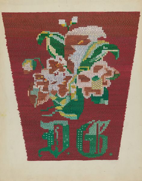 Curator: At first glance, it just hums with a peculiar domestic tranquility, doesn’t it? Almost… kitsch. Editor: Let’s take a closer look at Renee A. Monfalcone’s "Afghan," created around 1941. What strikes you is the deliberate patterning and its manifestation of the artist’s creative design process with fiber-art, textile design and drawing, where the subject is portrayed in regular, imprinted, layered repetition patterns. Curator: Patterns within patterns! It's like a quilt someone’s grandma obsessed over during a particularly existential winter. The colors feel so warm, yet something about that repetitive geometric pattern almost induces a sort of unsettling hypnosis. Does it remind you of anything in particular, or is that just me? Editor: The insistent geometry, its almost compulsive rendering, might lead us towards thinking of textiles as both comforting and constraining, simultaneously an act of nurture, a space for self expression, as well as one which imposes regularity on something essentially unbound: thread. The bright, somewhat flat application of red brings that tension to the foreground. Curator: Yes, I totally get the push-pull feeling here. It feels almost architectural, like some imagined building constructed entirely from knitted fragments. The ethnic patterning grounds it again somehow, making me feel safe-ish in what could otherwise feel alienating! Is it a natural stone pattern do you think? I feel like there is nature hidden within. Editor: It is fascinating how these associations build; one may interpret what appears organic, like flower petals or leafy boughs against rigid planes and a vertical design, or regard the design with no overt symbolism beyond exploring geometries. Whether it appears an "ethnic" pattern really depends upon whether such descriptions carry genuine ethnographic or social relevance. Curator: Fair enough, and perhaps my reading too eagerly embraces assumptions! Anyway, for me, the overall piece speaks volumes about how order can paradoxically emerge from chaotic repetition; it reveals, perhaps, what it really feels like inhabiting that tenuous boundary! Editor: Precisely. "Afghan" shows how a deep engagement with technique and material translates personal reflections on domestic objects that can express individual creativity and wider narratives on regularity versus freedom of expression.