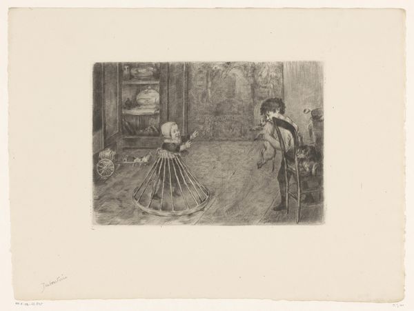 Curator: Robert Frederick Blum's etching, "Wash Day," captures a seemingly mundane scene. It's undated, though its style strongly suggests the late 19th century. Blum was an American artist known for genre paintings and his association with realism. Editor: There's a hushed intimacy here. The figures are shrouded in shadow, illuminated only indirectly, giving the whole piece a quiet, reflective mood. The domestic labor appears weighty. Curator: The subject, while seemingly everyday, is loaded with historical implications. Wash day was often a communal activity, performed by women, and reveals aspects of social structure and domestic life rarely given attention by academic painting during that era. Realism and its focus on labor shifted these dynamics. Editor: Notice how the light filtering through the window almost takes on a spiritual quality. The window can serve as a symbol of hope, or perhaps an opening for reflection on the drudgery of work; an entrance into somewhere beyond the confines of labor, though I see no real suggestion as to whether such freedom exists. Curator: Blum’s commitment to representing real-world scenes resonated with a broader trend of depicting ordinary life without idealization. Etching itself made art more accessible beyond the gallery. But who *saw* such work depended much on access and position. Images that seemed realistic for some remained invisible to others, especially those depicted *within* those images. Editor: Right, there’s an undeniable universality to the depiction of labour but also the more specific cultural history relating to gendered divisions in society, rendered more intimate through the artistic touches. Ultimately, this seemingly plain depiction leaves one to meditate on social structure. Curator: And that, in turn, gives viewers pause to reflect on the value that art can give the commonplace. Editor: A rather compelling visual memory of a world, and the labor, quickly fading into history.
