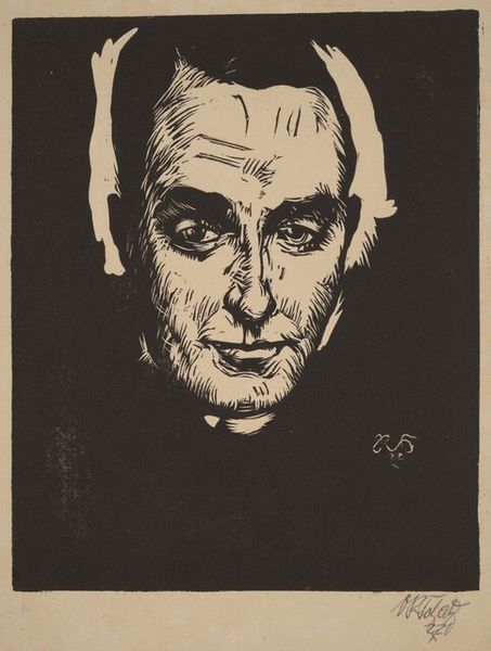 Curator: This striking woodcut, titled "Portrait of Yuri Korvin-Krukovsky," was created by Boris Kustodiev in 1926. The bold use of black and white immediately grabs the eye. Editor: It's unsettling, isn’t it? The sharp contrast, the almost grotesque exaggeration of the subject's features, combined with what looks like another figure looming behind… it suggests a feeling of anxiety or social critique, wouldn't you say? Curator: Indeed. Look at the meticulous craft in rendering this graphic artwork, specifically the medium: a woodcut print. Kustodiev's mark-making highlights the expressive possibilities inherent in the physical process itself, playing with positive and negative space with intention. Editor: Absolutely. Given the social and political climate of the time, the sharp lines and exaggerated features read almost like a visual protest. One wonders about Korvin-Krukovsky himself and the story of his representation here, right on the cusp of Stalinism. Was this art created as critique? Is this part of some radical and risky political agenda? The setting itself suggests theatre, almost stagecraft. Curator: Kustodiev seems aware of, or at least interested in playing with, printmaking conventions, manipulating line and texture as if deliberately highlighting its mass reproducibility as both form and content. Editor: That figure in the background...the stark stage, heavy shadows, and almost satirical approach create an intriguing atmosphere. There's a palpable tension created by these dark, high-contrast lines, prompting reflections on issues of social dynamics, power relations, and the precarious status of the individual during a period of upheaval. I read "XL" beneath the image - is it hinting at something I'm missing? Curator: Possibly. In a work of this type, the material qualities directly reinforce the message: a harsh rendering from unforgiving wood becomes something poignant. The image invites speculation. Editor: For me, this artwork serves as a reminder of the importance of scrutinizing societal and political forces and the complex ways those are expressed or oppressed under duress. Art such as this acts as a visual touchstone that generates critical reflection on our historical circumstances. Curator: Ultimately, through the use of line, contrast, and materiality, the portrait communicates beyond likeness alone. Editor: A provocative statement achieved through powerful design choices.