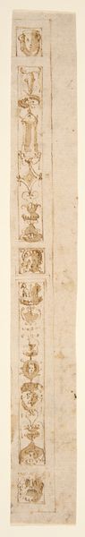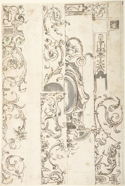 Curator: At first glance, this ink drawing feels rather dreamlike. Its pale, ethereal lines hint at something delicate, yet slightly grotesque. Editor: Indeed. What we have here is a sheet of studies made between 1500 and 1560, intended as grotteschi details for the Domus Aurea. It’s by an anonymous artist and is currently held at the Metropolitan Museum of Art. It showcases decorative elements. Grotesque, of course, meaning, in Renaissance terms, not ugly but rather a playful mix of human, animal, and vegetal forms. Curator: That certainly chimes with what I am seeing. A playful, fluid energy expressed through these whimsical shapes and almost architectural fragments. Do you find it significant that it's attributed to an anonymous creator? Does the absence of a known artist perhaps shift our understanding? Editor: In a way, yes. It allows us to move away from a cult of personality and focus instead on the collective creative energies and cultural aesthetics prevalent at the time. One might consider that these are not so much singular artworks but records of a wider cultural conversation, reflecting and shaping Renaissance sensibilities about beauty, the body, and the classical past. What does it suggest to you, artistically? Curator: The emphasis on line is striking, almost calligraphic in its quality. Note how each flourish and curve is rendered with such precision and control; these delicate, floating shapes make me think about the transience and artificiality of the decoration itself. The swan eating the plant looks very mannerist, with a stylized elegance. Editor: It is almost like observing the very grammar of ornamentation. Consider the impact of such designs. The rediscovery of classical motifs deeply affected Renaissance art and this piece testifies to the creative energy unleashed at the time. In its fusion of human, animal, and plant-like forms, there's perhaps a silent rebellion against established, static categories. It questions how art could liberate itself and influence the culture. Curator: Yes, a visual language that speaks volumes. Overall, the image appears weightless—ethereal forms seemingly suspended in air. And from that airy lightness also emerges the cultural underpinnings and complexities of the work itself. Editor: Ultimately, a conversation starter.