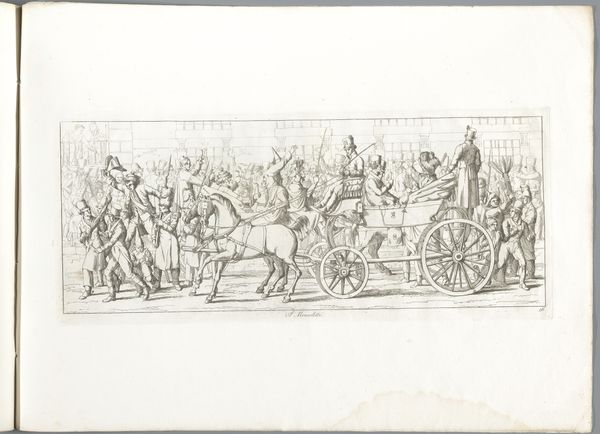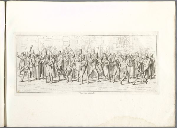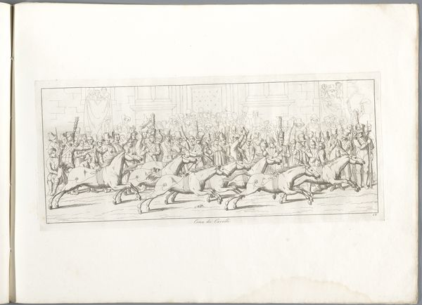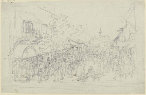 Editor: So, this is "Via del Corso," an ink drawing by Carl Gustaf Hjalmar Mörner, created around 1820. It's incredibly detailed, almost teeming with figures. I'm struck by how chaotic yet organized the composition feels. What can you tell me about it? Curator: The sheer volume of figures indeed speaks to the vitality of street life, a recurrent subject during the Romantic period. Have you considered the implications of showing figures in different dress and station mingling in this manner? Editor: I guess it suggests a certain level of social mixing, maybe even commenting on class structures? Curator: Precisely! The "Corso" wasn't merely a street; it was a stage for social performance. But look closely at the smaller dramas playing out: the squabbles, the exchanges, even the figures collapsed on the ground. Are they merely anecdotal, or do they carry symbolic weight? Editor: Hmm, maybe they reflect the instability or perhaps even the anxieties of the time? A kind of romantic ideal meets street realism? Curator: An excellent observation. Each figure is meticulously rendered, their gestures and expressions carefully considered. Doesn't the overall effect create a narrative about societal values, public behavior, or unspoken rules? Think of it as a stage teeming with allegories. What do you see now? Editor: I see it as less of a snapshot and more of a commentary. It feels less like everyday life and more like Mörner trying to capture something bigger. Thank you! Curator: The image becomes a repository of cultural memory. Every era remakes these symbols to mean different things, after all.
