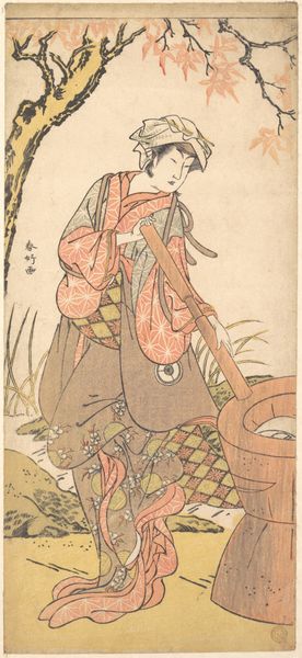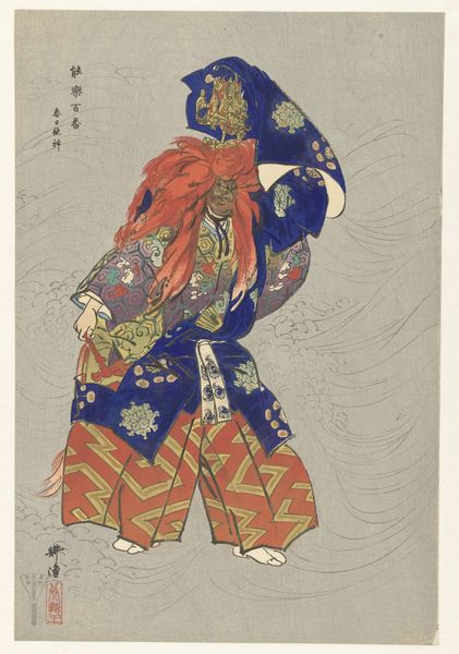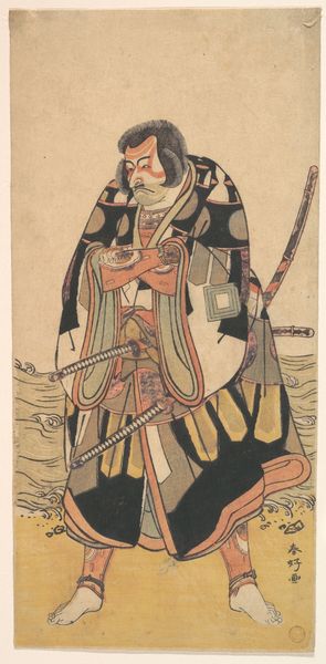 Editor: Right now, we're looking at Katsukawa Shunko's woodblock print, "The Actor Matsumoto Koshiro IV on a Bullock in a Snowstorm," created somewhere between 1780 and 1800. The title says snowstorm, but to me, it looks more like a gentle snowfall, lending this entire piece an oddly calming effect. I wonder, what strikes you when you look at this print? Curator: Calming, you say? Yes, perhaps the swirling flakes have a quiet intensity. But for me, it’s the precarious balance of the figure atop the bullock in that weather! Do you think there's a deeper performance unfolding before us? This isn't merely a portrait, is it? Look closer at his stern gaze; what story do you imagine he's embodying? Editor: Hmm, you’re right, that stern gaze does suggest a role being played. Given it's an actor, and considering the turbulent weather, maybe it’s about resilience in the face of adversity, a sort of stoic acceptance of the storm? Curator: Exactly! The falling snow is a challenge to that inner steadiness. Ukiyo-e often captures these fleeting moments of transformation. Perhaps, he represents a specific character renowned for such unwavering resolve. Or maybe, and I’m just riffing here, this bovine companion becomes a stand-in for the grounding influence needed when navigating life’s blizzards. A curious combo, isn’t it? Nobility meets earthy groundedness. What do you think about the umbrella? The element is visually strange. Editor: Now that you mention it, that umbrella…it's shaped like a mushroom! Is it there to keep the snow off the actor, or to suggest… something else? The boundary between practical and metaphorical feels super-fuzzy here. Curator: Indeed! It reminds me of a visual poem – fragmented meanings swirling around an essence just out of reach. Isn't it wonderful how art from centuries ago can still ignite these playful possibilities? Editor: It truly is. I had initially missed so much of the depth, seeing only a literal depiction. Curator: That's the fun, though, isn’t it? Each look unveils another layer.