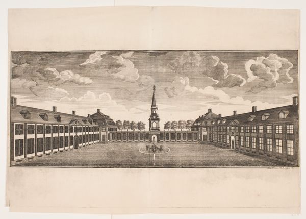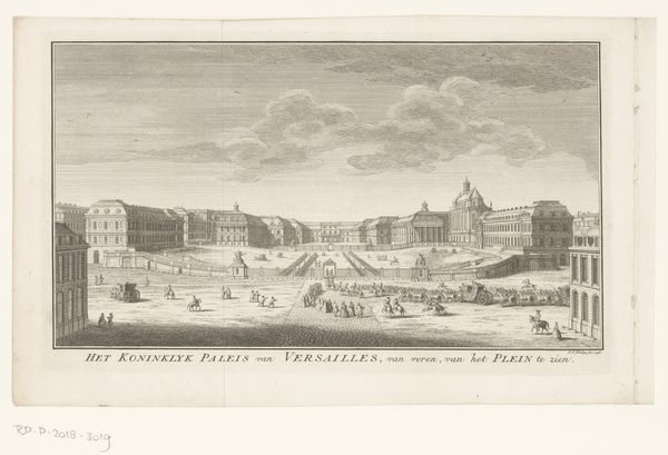 Editor: Here we have Robert Sayer’s "Gezicht op de Horse Guards Parade te Londen met het vertrek van George II Augustus, koning van Groot-Brittannië, naar de House of Lords," likely from 1753, made with watercolor print. The scene seems so ordered, yet also populated with smaller figures... What story is it telling? Curator: Well, the piece documents a specific moment, King George II's departure to the House of Lords. But it's important to consider what this carefully staged scene *performs*. How does the image construct power dynamics and legitimize the ruling class through its representation of space and social interaction? Editor: So, the act of depicting the event itself is a kind of...propaganda? Curator: Perhaps "propaganda" is too strong, but yes, it contributes to a certain narrative. Consider the artistic choices: the detailed architecture versus the somewhat generalized figures. It centers the institution, the spectacle of power, rather than individual agency. Who has access to this space? Who is performing for whom? These are vital questions. Editor: I see what you mean. It does feel like the people are almost like props, accentuating the grandeur. Curator: Exactly. And how might gender and class intersect here? Consider the implied audience, likely wealthy and privileged. How does this image reinforce their social position? Editor: It is a picture that communicates social status. The detailed buildings highlight luxury, and it portrays the elite attending to governmental matters. Curator: Indeed. By unpacking these layers, we move beyond a simple landscape view and enter a space where art becomes a tool for understanding social structures and power relations. We’ve both certainly thought about this work in greater depth today.
