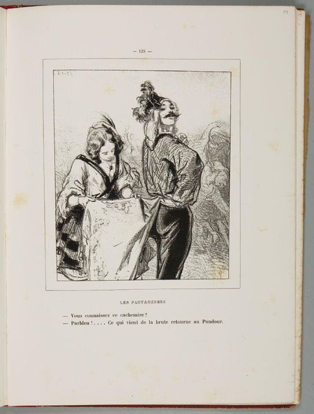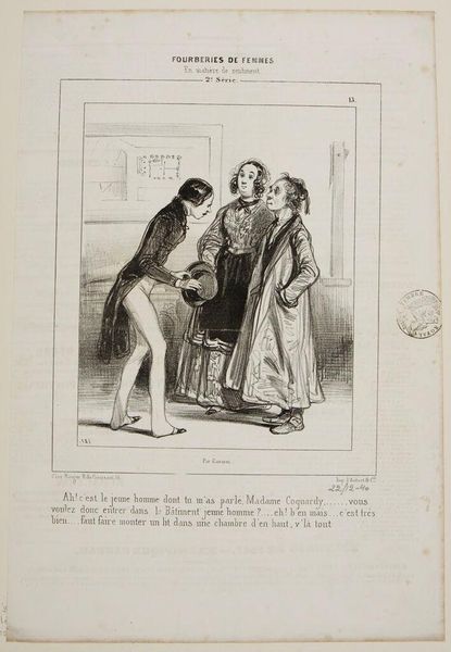Editor: This is "...and I will presently be hurled in a heap, from the summit of the North Tower! ... All this, Sirs, refers to my virtue." by Paul Gavarni. The stark contrast and theatrical expressions give it a darkly humorous edge. What symbols stand out to you? Curator: Note the woman's dress, almost a shroud. It suggests innocence, perhaps even a sacrifice. The two men leering beside her, are they accusers? Consider how cultural memory shapes our reading of virtue and vulnerability. Editor: It’s interesting how the title gives a context that the image alone doesn't quite convey. Curator: Indeed. Gavarni uses familiar archetypes, imbuing them with psychological complexity. What might this say about the cultural anxieties of his time? Editor: It really highlights how an image, coupled with text, can shift meaning. Curator: Exactly. It’s about unlocking those layers of cultural coding.