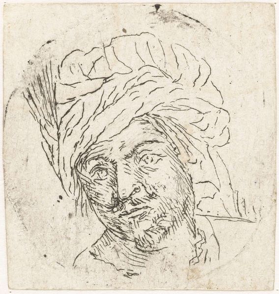 Curator: Here we have John Hamilton Mortimer's "Head of a Man in a Cloth Headdress", held at the Tate. Editor: Wow, he looks weary, doesn't he? The rapid hatching and the downward gaze give him such a weight. Curator: Indeed. Note the dynamism inherent in the line work. The composition is carefully structured to emphasize the subject’s dejected posture. Editor: It’s like a quick thought, a fleeting moment. He’s there, and then, because of the lines, he's almost gone. Curator: The artist, Mortimer, who died so young, used the graphic medium to capture the psychological depth of his subjects, a trend emergent during the 18th century. Editor: I wonder what he was thinking about. He looks as though he’s carrying the world on his shoulders. Curator: A potent observation. Let's move on to the next piece.