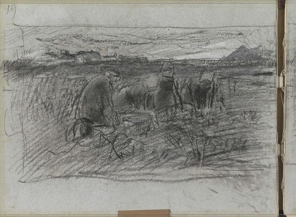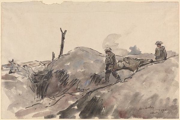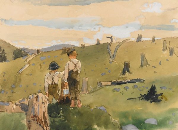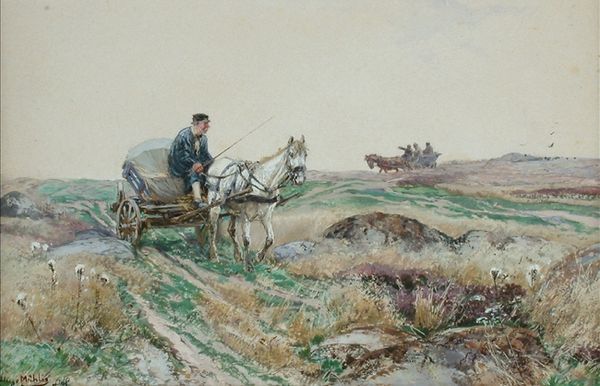 Curator: What immediately strikes me is how solitary it feels, even with the dog present. There’s something mournful in that open landscape and the way the hunter blends into it. Editor: This watercolour drawing, “Hunter with Dog” by Hugo Mühlig, speaks to the tradition of landscape painting while simultaneously gesturing toward human impact on the environment. Let’s explore that tension further. Curator: Absolutely. The hunter, seen from the back, is almost swallowed by the scene. His purpose, normally associated with domination and control over nature, seems diminished here. Consider the figure itself, a symbol of privilege. The act of hunting has complex colonial undertones regarding ownership and land rights. Editor: I see the enduring iconography of man and animal in collaboration; they move through the landscape as a single unit. Dogs have long been symbolic, shifting meanings according to era, from loyalty to guardianship. Notice how Mühlig captures the taut, coiled energy of the dog, posed mid-hunt. Curator: But who does this collaboration serve, and at what cost? Hunting is seldom a neutral act. This landscape, seemingly untouched at first glance, is actually a contested territory. The watercolours feel delicate, pretty even, masking this inherent violence. Editor: And yet, there's also something classically bucolic at play, evoking pastoral scenes. Hunting in art has historically symbolized man's dominion over nature but could also represent essential sustenance, survival. In Mühlig's composition, though, a stillness prevails—the outcome of the hunt is unwritten. The eye is drawn into the vast open space. Curator: True. Considering this from an eco-critical perspective, though, prompts uncomfortable questions about man's relationship to the land. This piece encourages conversation around how power dynamics inform even seemingly idyllic landscapes. Editor: The enduring symbols and artistic tradition invite layered reflections. This piece serves to both comfort and provoke further understanding about culture's historical relationship with landscape and its inhabitants.
