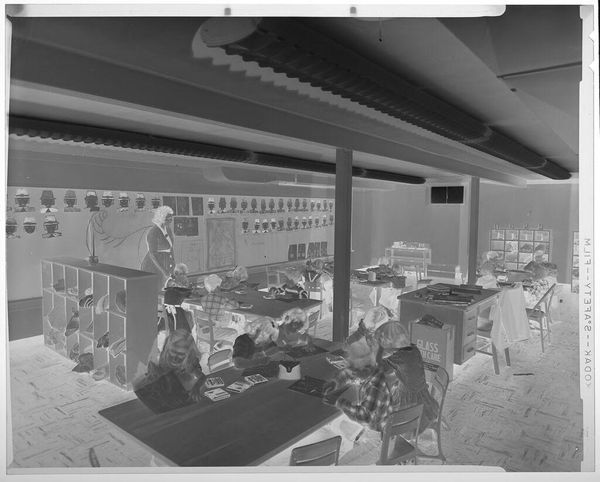 Curator: This photograph, simply titled "Untitled (office with receptionist and coatrack)," was created by Lucian and Mary Brown. Editor: The composition is quite stark. It seems to capture the mood of an office space, but the figures feel somewhat frozen or detached. Curator: Indeed. The image evokes a sense of institutional memory. The figures seem like archetypes of office workers, their postures and activities reflecting a bygone era of business culture. It reminds us of mid-century corporate environments. Editor: Perhaps it's the high contrast, but that coatrack and the waiting figure carry a certain symbolic weight. A transient space of potential and delay... what are they waiting for? Curator: The ambiguity invites us to consider the psychological space of waiting, the role of the receptionist as a gatekeeper, and the symbolism of the coatrack as a representation of transient roles. Editor: Well, seeing it through that lens enriches the image beyond just a historical document. It reveals something deeper about the human condition within such spaces.