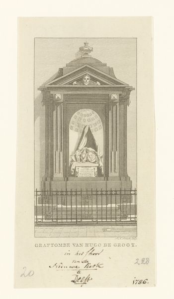 Curator: Looking at this print, made in 1786 by Johan van der Spruyt, we see the tomb of Hugo de Groot, who passed away in 1645. The print resides in the Rijksmuseum's collection. Editor: It is a stark but beautifully rendered neoclassical image, somber in tone due to the monochromatic engraving. The precision in the architectural detail strikes me. The sharp contrast enhances the overall dramatic feel. Curator: Indeed. The artist, working in the Neoclassical style, seeks to convey a sense of order, rationality, and civic virtue, very typical for this movement, which reacted to the excesses of the Baroque and Rococo. Hugo de Groot himself was a key figure, and his tomb becomes a symbol of legal and intellectual achievement. Editor: Visually, I'm drawn to the interplay of light and shadow within the structure, how the engraver managed to give form to the marble-like surfaces. Did you also notice the skull at the top? Curator: I did! It's a potent memento mori, serving as a reminder of mortality, quite common in memorial art throughout history. The cityscape or town view within the tomb's arch alludes to de Groot's world—his intellectual domain, his community and the ideas he shaped. The iron bars add a sense of distance between us and the object. Editor: That dome is constructed like a visual puzzle—a delicate assembly that serves both architectural and symbolic purposes. The formal geometry reinforces the rationality the engraver sought. Curator: And in considering that rationality, we should reflect on how the print itself, as a multiple, extends the reach of de Groot's legacy and ensures its continuity within the Republic's collective memory. Editor: A very interesting way of seeing it, connecting visual structures and political life to enhance public understanding of Hugo de Groot's life. Curator: Right. What the piece means as both a symbolic object and historical document remains incredibly evocative for contemporary audiences.