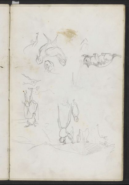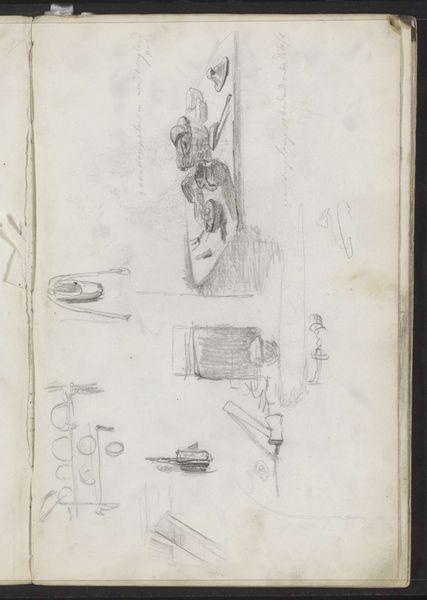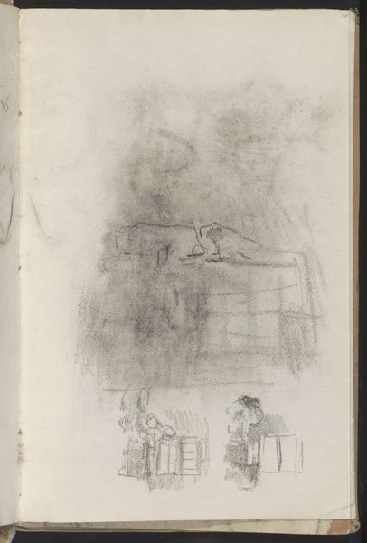 Curator: Here we have Jozef Israëls’ "Lastdrager, een vrouw aan een tafel bij een venster en twee liggende katten," which roughly translates to "Bearer, a woman at a table by a window, and two lying cats." It dates to about 1855-1859 and is currently held here at the Rijksmuseum. Editor: My immediate reaction is one of intimacy tinged with melancholy. The loose pencil strokes convey a certain rawness. There's a real sense of lived experience etched into this simple sketch. Curator: Absolutely. Israëls, known for his Realist depictions of Jewish life and the plight of the working class, encapsulates themes of poverty and resilience in this modest work on paper. The juxtaposition of the weary figure above, contrasted with the woman in the domestic interior, and the listless cats, is a poignant statement on social burdens. Editor: The bearer, the woman, and even the animals become symbols. I see echoes of depictions of the Pietà or even Atlas burdened with the weight of the world in that central figure above. While the woman at the table might symbolize domesticity, her bowed head and the rather muted palette create an impression of stifled hope, like a 19th century memento mori. The cats reinforce this mood with their weary rest. Curator: Precisely. And let’s consider Israëls’s identity as a Jewish artist living through a period of social upheaval. The figures in the sketch carry the symbolic weight of his community’s struggle against marginalization and antisemitism. It invites us to empathize with the daily burdens borne disproportionately by those on the fringes of society. Editor: It’s also fascinating how Israëls employs the rough medium of pencil on paper. The unfinished quality speaks to the precariousness of the subjects’ lives, highlighting a state of transience and unease. Curator: And this contributes to a feeling of accessibility; of an artist bearing witness rather than idealizing. In viewing the artwork through this lens, it resonates far beyond its historical context. Editor: A deeply evocative piece, and by highlighting the interconnection of individual stories it echoes wider societal concerns about vulnerability and empathy, leaving you to really reflect on shared experience. Curator: Indeed. It's a beautiful, humble drawing with many layers of depth when viewed in the context of both its time, and in dialogue with contemporary social realities.