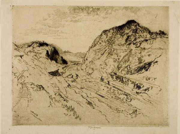 Editor: This print is titled "California Coast, Big Sur," by Ralph Fletcher Seymour. I think the sweeping, almost dizzying, view makes me feel like I'm really standing on a steep incline looking down. What stands out to you about it? Curator: What immediately grabs my attention is how Seymour utilizes etching to engage with the sublime landscape tradition, popular in the late 19th and early 20th centuries. He's capturing a specific site, Big Sur, which held increasing cultural importance as a place for tourism and recreation, contributing to California's self-fashioning as a paradise on Earth. Do you notice how the ruggedness is somewhat softened? Editor: You're right, the mountains almost feel gentle despite their scale. So the etching process allowed Seymour to frame California as this accessible, idyllic landscape? Curator: Precisely. This wasn’t a purely objective rendering; it actively participates in promoting an image of California. Think about the accessibility of prints; they were much more affordable and distributable than paintings. How might this affect the viewers’ interpretation? Editor: Well, maybe people who couldn’t travel could still feel connected to this specific place, helping establish Big Sur’s place in the cultural imagination? Curator: Exactly! So, while it depicts a seemingly untouched vista, remember that it’s also reinforcing and responding to evolving cultural attitudes and, frankly, promoting ideas about tourism, leisure, and even land value. What's your takeaway from that? Editor: I'm starting to see that it’s not *just* about the beauty, but about how that beauty was strategically communicated and circulated. Thank you! Curator: And it shows that landscape art is so often interwoven with the politics of place, doesn't it? A reminder to look beneath the surface, always.