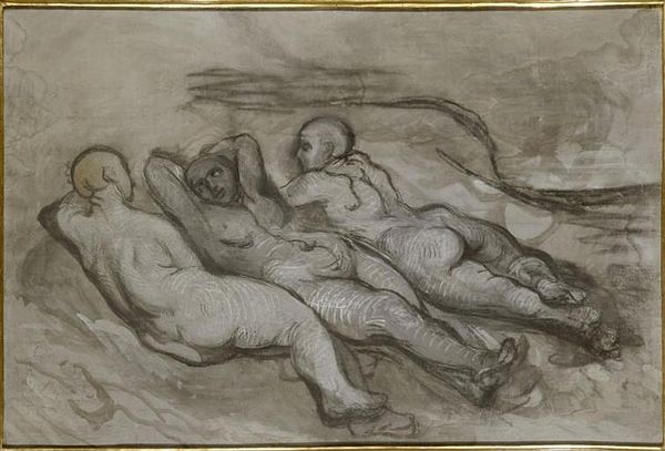 Curator: This is a pencil and ink drawing entitled *Nereids and Tritons* from the 18th century. It’s currently held here at the Metropolitan Museum of Art. Editor: My immediate reaction is that it feels almost dreamlike. The soft gray paper really emphasizes the fluid, sketched lines. It’s captivatingly ethereal, as if pulled from the depths of memory or imagination. Curator: The subject matter certainly contributes to that. Nereids and Tritons, sea nymphs and mermen, are deeply rooted in Greek mythology. They’re often associated with Poseidon, embodying the unpredictable and often turbulent nature of the sea. The artist really captures their wild spirit. Editor: Looking closer, you can see where the artist carefully built up layers with the pencil and ink. Note how the darker areas define form and movement, giving the figures depth, particularly on the Triton’s flanks. It speaks to a real engagement with process and materiality. Curator: Precisely. And those figures are laden with symbolic weight. Nereids are linked with feminine grace, intuitive wisdom, and, of course, the subconscious. They offer safe passage. And Tritons, often portrayed as messengers of the sea, have both benevolent and fearsome aspects reflecting the power of nature. Their very being blurs the boundary between human and animal. Editor: Absolutely, the ambiguity in their forms connects directly with the physical making of the art itself, though. The use of drawing allows for a kind of provisionality, and even instability, to the artwork. We never quite arrive at a fully resolved or 'fixed' image; that feeling of constant shifting reflects those thematic ideas you’re touching on. It’s so smart. Curator: What intrigues me most is how the figures seem both playful and almost melancholic, that contrast of emotions embedded within their depictions. Are they celebrating or lamenting? Or perhaps it reflects our own complex relationship with the sea - our simultaneous attraction and respect for it. Editor: Well, after really diving in, I appreciate the subtleties of the materials even more. The understated choice of pencil and ink, that simple act, lends the subject such an incredible richness. Curator: Yes, it leaves us contemplating timeless mysteries of nature, the sea, and the depths of our own psyches.