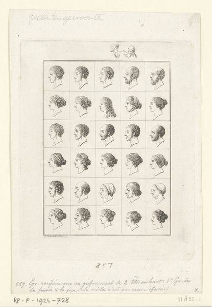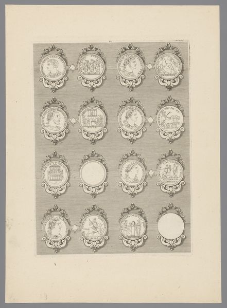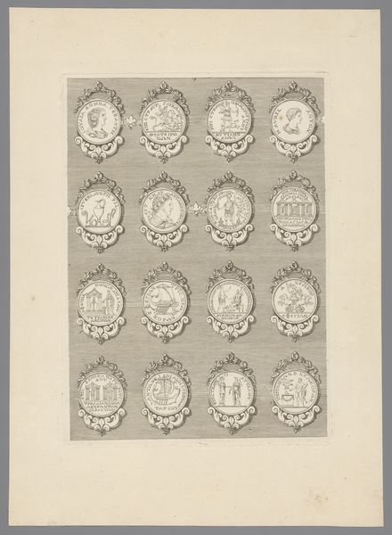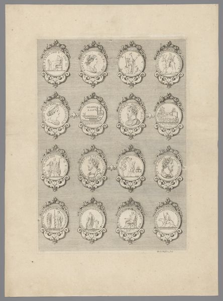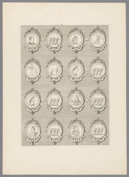 Curator: This engraving, likely created between 1647 and 1682, is titled "Zestien penningen met versierde lijsten, waarvan één blanco," meaning "Sixteen coins with decorated frames, one of which is blank". It's attributed to Simon de la Boissière and made using ink on paper. Editor: It feels very ornamental, almost like a sampler. The linear precision, the delicate curlicues of the frames…it's quite striking in its clarity. Curator: Exactly. What's compelling here is understanding the political power imbued in imagery. Coinage, even represented like this, circulated not just money but ideals and authority. Look how each coin vignette acts as a mini history painting, referencing Roman leaders and deities. Editor: You know, it’s interesting you mention history paintings because while there’s the appeal of accessing small snippets of historical narratives, formally I find the balance and repetition in this design quite arresting. It makes one wonder if this work was simply an exercise in artistic skill. Curator: Possibly so. But let’s remember this engraving was made during a time of significant upheaval and the assertion of Dutch power. Images, carefully curated and widely distributed through prints, helped cement national identity and legitimize rule. That one blank space also strikes me as purposeful. Editor: Right, the blank coin, perhaps inviting the viewer to insert their own ambition, literally "fill in the blank?" On another level, notice the circular format echoed in the looping decorations connecting each coin. The geometric play contributes to a visual harmony—almost meditative in quality. Curator: An insightful reading! In art, there is power. Works like this remind us how art played an important part in defining civic values, or creating an image for an emerging state to present itself on an international stage. Editor: Well, for me, examining it at a surface level offers a great experience by itself. Its orderly composition makes it inherently satisfying.