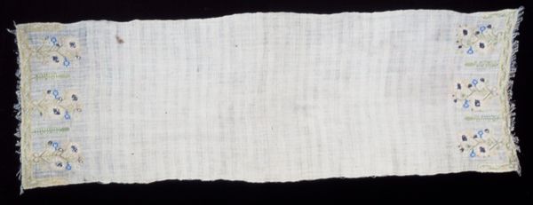 Editor: Here we have a textile piece entitled "Sash," dating back to the 18th century. It's made of silk and some other fibre, and is attributed to an anonymous creator. The pale colour and delicate texture give it such an understated feel. What can you tell me about it? Curator: Indeed, the texture holds the key. Look closely at the geometric patterns, and how they repeat and evolve at the ends. Doesn't this call to mind other repeating motifs across cultures? Think about the Greek key or Celtic knots. This "Sash" functions less as mere decoration and more as a mnemonic device. Editor: Mnemonic device? How so? Curator: These repeated patterns become visual cues. Perhaps they aided in remembering stories, lineage, or even social standing. We tend to associate textiles with the domestic, but they served crucial functions in broader social contexts. The pattern provides not just ornamentation but memory and status. The silk hints to trade routes, global connection. Editor: So, something we might easily overlook held symbolic importance and also represented broad trade routes? That is such an interesting observation to make. It gives me a lot to consider. Curator: Visual culture connects deeply with what and how we remember. Next time you are looking at what seems a very neutral and understated piece, imagine how powerful the memory encoded within the item really is. Editor: I definitely will from now on! Thanks.
