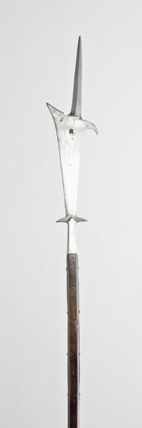 This is a Sikin Panjang, a type of sword originating from Sumatra, Indonesia. It's made of iron, brass, and wood. The sword's iron blade is long and straight, while the hilt is crafted from a lighter wood and shaped like a pair of budding tree branches. The sheath is also made from wood, carved with a repeating, symmetrical design. Notice the use of geometric patterns, a common motif in Indonesian craft, demonstrating great skill and precision in the carving. The sword’s design and craftsmanship reflect the cultural values and traditions of the region, but it also tells a story about labor and politics. This specific Sikin Panjang was owned by a Dutch General, G.C.E. van Daalen, who acquired it during the colonial era. Its history is, therefore, deeply entwined with colonialism and power dynamics, turning this from a cultural object into a symbol of military authority. Looking closely at the materials, making, and historical context, helps us see the full meaning of this artwork.
