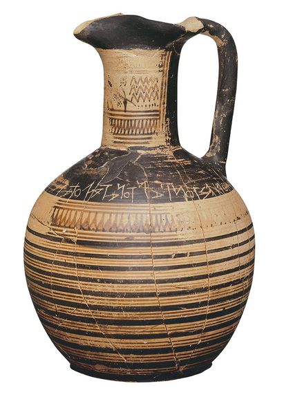 This Attic Middle Geometric Amphora was made in Greece around the 8th century BC. The potter's wheel had long been in use, but with the rise of the Greek polis, or city-state, such as Athens, we see a renewed interest in monumental vases for civic use. The Kerameikos was the potters' quarter of ancient Athens, and this amphora, made from local clay and decorated with abstract geometric motifs, shows the level of specialization that had developed there. Note the meander patterns and the concentric circles, which are typical of the period. Such imagery, repeated across numerous vases, shows the existence of shared cultural codes and values. It’s likely that this vase was used in a funerary context, perhaps as a grave marker or as a container for offerings to the dead. In studying works such as this, historians look to archaeological records and ancient texts. The role of art in the life of the polis is contingent on these social and institutional contexts.
