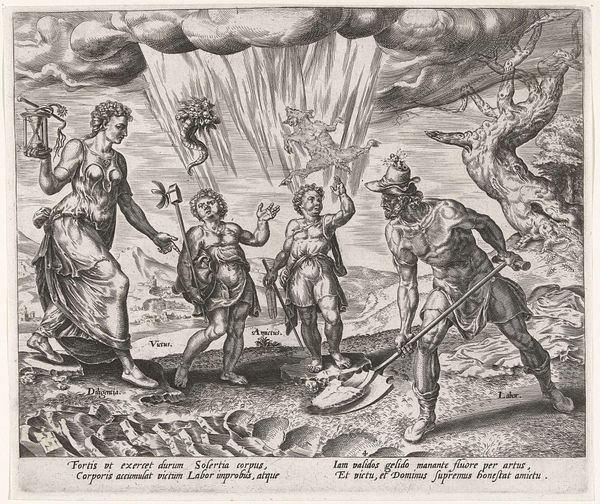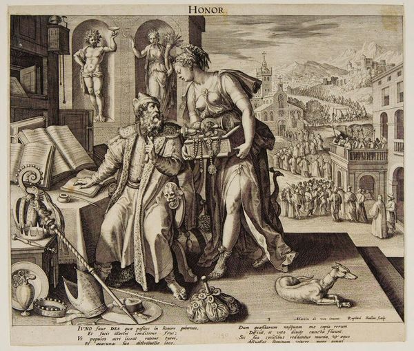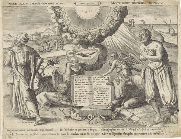 Dirck Volckertsz Coornhert created this engraving, "Luther onthult het bedrog van de katholieke geestelijkheid", or "Luther reveals the deception of the Catholic clergy," sometime in the late 16th century. It’s a potent example of how printmaking could be used to spread political messages far and wide. Look closely, and you can see the fine lines incised into the metal plate, probably copper, with a tool called a burin. This required considerable skill, as the image is built up through precise, controlled cuts. The density of these lines creates areas of shadow and depth. But it’s the image itself that really speaks. The act of revealing is central—Luther pulls back the curtain to expose the true, corrupted nature of the Catholic clergy. Printmaking, in its capacity to disseminate ideas, played a crucial role in the Reformation, challenging established hierarchies and enabling new ways of thinking. This artwork reminds us that materials and making are never neutral; they are always embedded in social and cultural contexts.