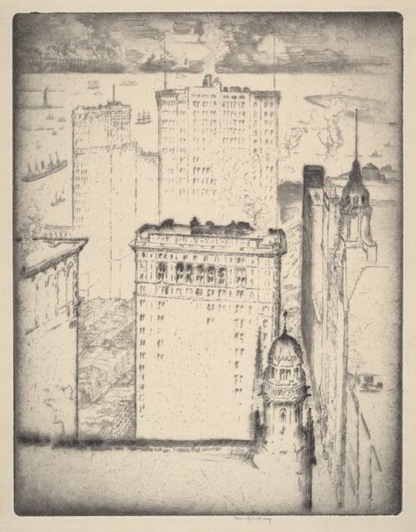 Curator: Donald Shaw MacLaughlan, born in 1876, created this print titled "Sky-line, Chicago," now residing at the Harvard Art Museums. Editor: It's striking, isn't it? The concentration of vertical lines—it evokes a sense of burgeoning industrial power. Curator: Indeed. Note the skillful use of hatching and cross-hatching to define form and create depth within the architectural masses. MacLaughlan coaxes a range of tonal values from the etched line. Editor: And what about the implications of this urban landscape? We must acknowledge the labor and the socio-economic disparities inherent in such a built environment. Curator: Perhaps, but the formal arrangement is what truly commands attention here. The carefully balanced composition creates a harmonious tension between the individual structures and the unified skyline. Editor: Ultimately, the image provokes questions regarding progress and its consequences—a reflection of early 20th-century urban anxieties. Curator: An astute observation; however, the pure aesthetic experience derived from the artist's mastery of technique cannot be overlooked.