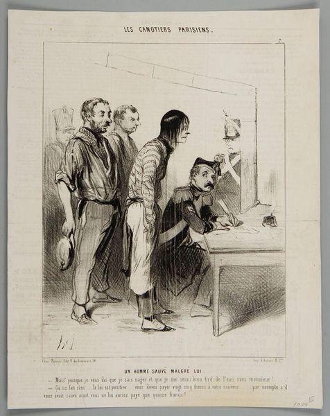 Editor: This lithograph, "You gentlemen doubtless have some game to declare?" by Honoré Daumier, feels like a jab at… well, someone. The faces are so expressive! What's your take on this scene? Curator: Ah, Daumier! He's like a visual comedian with a sharp wit. Notice how the tax collector, so to speak, seems to be questioning these hapless hunters. The whole scene is a beautiful commentary on the absurdity of hunting, isn't it? Editor: Absolutely! And the detail in the faces really drives that home. Curator: Daumier’s gift was that he could see the irony in everyday life. It makes you think, what are we *really* chasing? Is it just... aches and pains? Editor: I hadn't thought about it like that, thanks! Curator: My pleasure.
