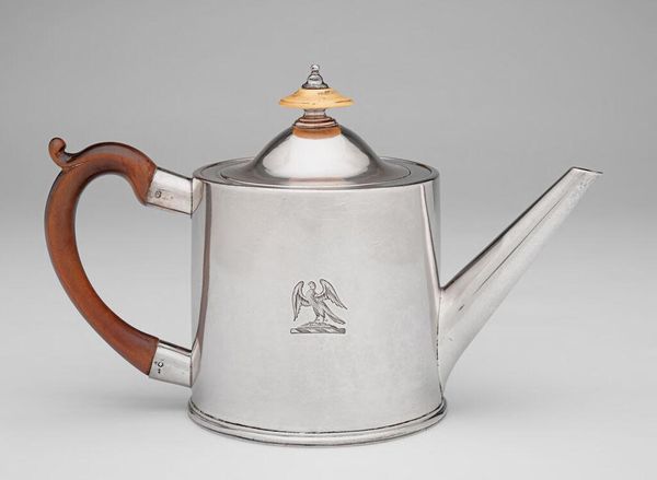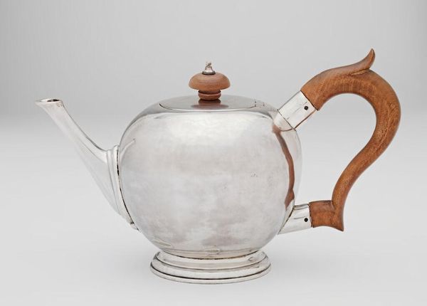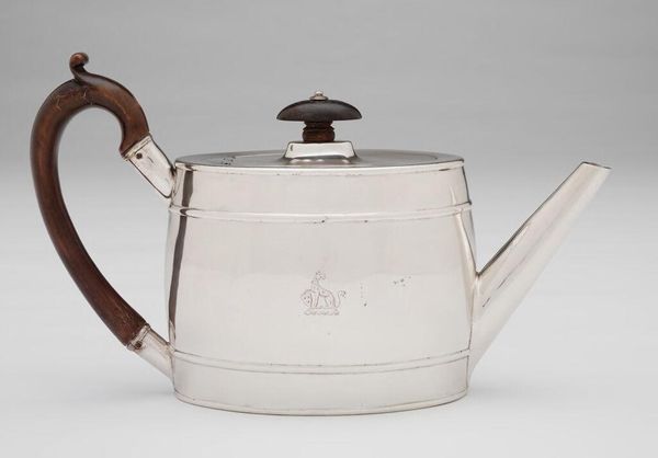 Editor: This striking silver teapot, maker's mark SW, presents a fascinating study in domestic functionality elevated to art. The clean lines and polished surface suggest both utility and status. What can you tell me about the social context of such an object? Curator: Well, the presence of such an item speaks volumes. This wasn’t simply a teapot; it was a symbol of wealth, gentility, and participation in a global trade network. Tea itself became a potent symbol of social ritual and even political power. Editor: Political power? How so? Curator: Think about the colonial history tied to tea. Owning a silver teapot connects a family to those larger narratives of trade, empire, and even revolution. Editor: That is more than I expected from such a simple object. It really puts the piece into perspective. Curator: Exactly! Everyday objects often carry the weight of history.