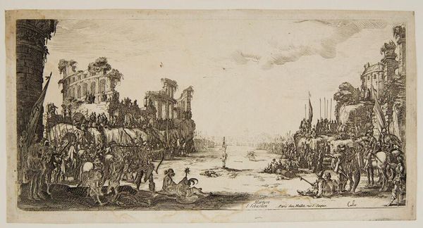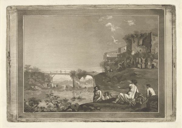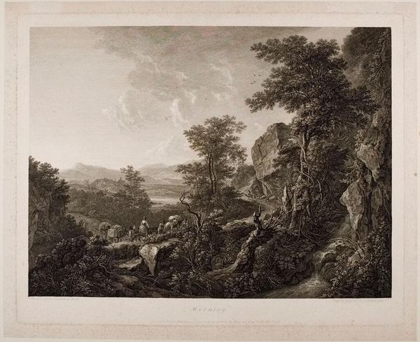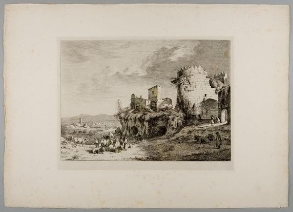 Editor: Here we have Johann Balzer’s "Landscape with Rustic Bridge," from the late 18th century. It looks like an etching, full of pastoral imagery. What do you make of its portrayal of rural life? Curator: It’s fascinating how Balzer, likely catering to an urban audience, romanticizes the countryside. Notice the classical statue juxtaposed with working animals. How does that tension speak to the social hierarchy of the time? Editor: It feels like the artist wants to elevate this seemingly simple landscape. Curator: Precisely. These landscapes served as visual rhetoric, influencing how the public perceived the relationship between the ruling classes and the land they governed. What do you think? Editor: I see your point about the socio-political message. I hadn't considered that. Curator: Art always reflects its time.