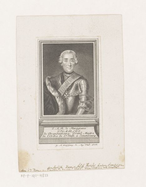 Curator: It’s my pleasure to introduce this engraving to you, “Portret van Koning Willem I in ornamentlijst”, or “Portrait of King William I in an ornamental frame,” created in 1838. Editor: It strikes me as rather austere. The stark black and white, the severe expression—it all conveys a sense of formality, a rigid structure. Curator: Indeed, that's very much aligned with the Neoclassical ideals of the time. This portrait served as a very deliberate projection of power. Prints like this were vital tools for disseminating a certain image of the monarchy to the wider public. It's not just a likeness, but carefully constructed propaganda. Editor: Observe the texture achieved solely through the fineness and variation in the engraved lines. From the fabric of his coat to the feathered detail in the surrounding crest. The artist truly understands light and shadow, imbuing the piece with a sort of depth and subtle realism. Curator: And the details in the frame are politically telling. Above the portrait is a shield, crowned and guarded by cherubs, representing the Dutch monarchy. Below, that miniature scene—it seems to portray the king as a protector, almost divinely appointed. The imagery aimed to legitimize and celebrate the Dutch kingdom after a turbulent period of revolution and Napoleonic rule. Editor: Though small in scale, the print possesses a striking presence due to the careful use of light and shadow and the complex layering of symbolic ornamentation. Curator: The engraving offered a portable, reproducible, and affordable means of representing royal authority across society, reinforcing national identity and loyalty. Editor: Considering all that’s here, my initial reaction, while rooted in its austere qualities, certainly overlooked the dynamism between the work's visual construction and complex socio-political symbolism. Curator: And seeing the print displayed here at the Rijksmuseum—once again viewed by a large public— it’s clear how institutions play a vital role in preserving and presenting these kinds of narratives.