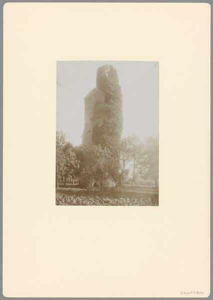 Editor: This is Bruce Conner's "Take Two, D.H.O.M.S., Vol. I, No. 8" from the Harvard Art Museums. It’s a striking print, maybe a photogravure. The monument appears surreal, almost unstable. What do you see in its formal composition? Curator: Observe how the artist employs stark contrasts to create visual tension. The geometric monument clashes with the organic forms of the surrounding foliage. Note the repetition of rectangular shapes, subtly offset by the wreath’s circularity. Do you think this enhances or detracts from the piece? Editor: I think the tension adds to the work. I hadn’t considered the repetition before. Curator: These formal elements—the interplay of light and shadow, geometric versus organic forms—create a dialogue that is both visually arresting and conceptually intriguing. The visual rhythm invites contemplation. Editor: That's a new perspective for me. Thanks! Curator: Indeed, a stimulating exercise in visual literacy.