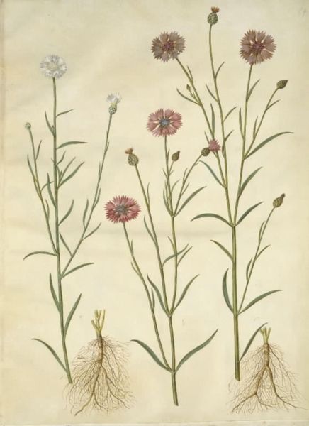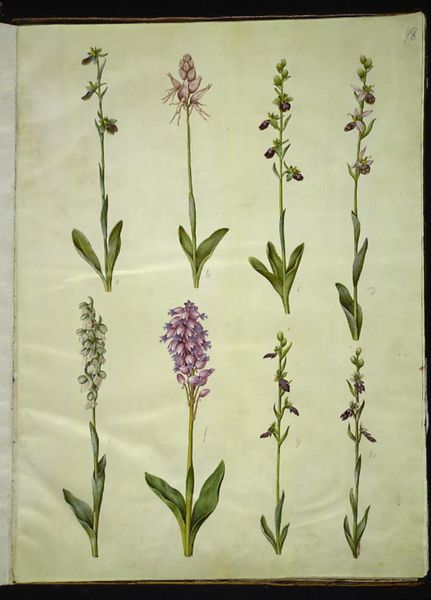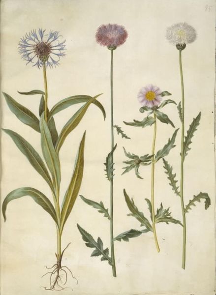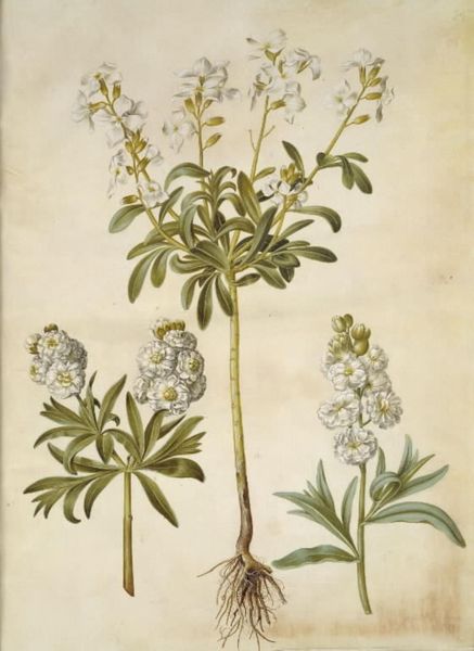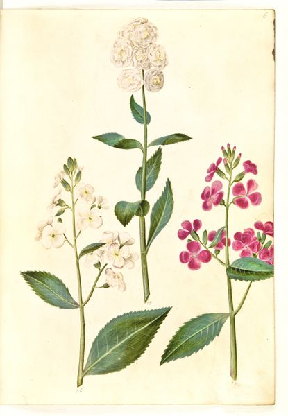 Editor: Here we have "Hesperis matronalis," or "almindelig aftenstjerne," by Hans Simon Holtzbecker, created sometime between 1649 and 1659 using watercolor, gouache, and drawing techniques. The depiction feels incredibly precise, almost scientific. What do you make of its carefully rendered details? Curator: These flowers, commonly known as Dame's Rocket today, aren’t merely botanical illustrations, but repositories of cultural memory. The rendering, rooted in realism, speaks to a Northern Renaissance fascination with the natural world, but what stories might the "aftenstjerne," the evening star, whisper to us? Editor: Evening star… That gives a completely different feel! What kind of stories? Curator: Consider how flowers functioned symbolically. Beyond beauty, plants conveyed moral and emotional narratives. What could the colors – the white and soft lilac – imply about the virtues, or even the social status, associated with this flower? Perhaps it was favored for its scent or its medicinal properties. These qualities accrue meaning. Editor: So, the evening association… a white flower… Is there a connection to the night or even death, maybe a quiet reflection? Curator: Potentially. White, especially, has multifaceted meanings - purity, mourning, divinity. It invites us to consider the duality of symbolism. It also draws our eye to how color carries powerful emotional information and alters how we see things, then and now. The level of realism lends authority to the interpretation. What's revealed or concealed about its place within its era by it, I wonder? Editor: That’s a lot to consider in just one botanical illustration! It really does make me wonder what else is there. Curator: Indeed, and perhaps that's precisely what Holtzbecker intended – to prompt questions, and connections beyond the purely representational.