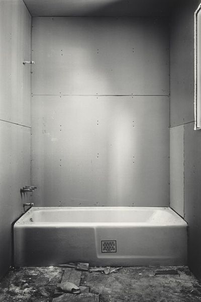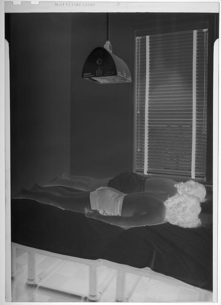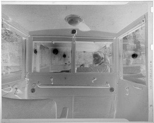 Editor: This is Jack Gould's "Untitled (model home kitchen)," a photograph of a kitchen interior. It's striking how the negative image emphasizes the slick surfaces and manufactured forms. What can you tell me about this piece? Curator: This image, presented as a negative, throws into sharp relief the industrialized nature of domestic space. Consider the labor involved in producing these standardized units. The photograph itself, a reproducible medium, further emphasizes the themes of mass production and consumption inherent in the model home. Editor: So, the medium itself becomes part of the message about mass production? Curator: Precisely. The photographic negative reveals not just a space, but also the processes that create and circulate it. Editor: That's a different way of thinking about the kitchen - less about the family and more about the factory. Curator: Indeed, and the material conditions that shape our daily lives.