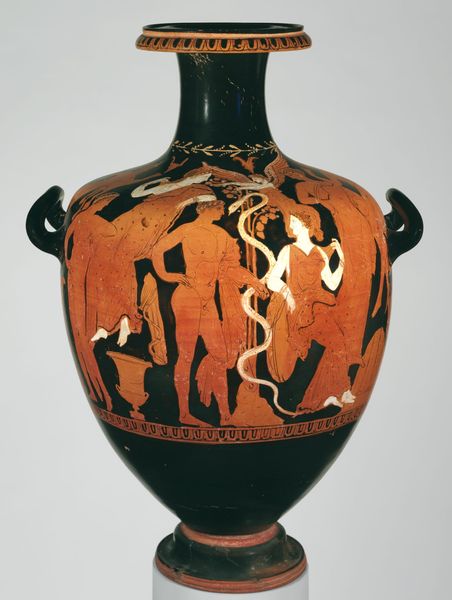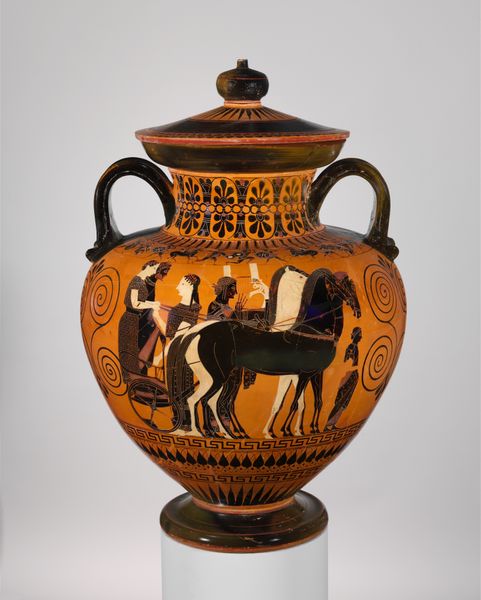 This terracotta pelike, a type of jar, was crafted in ancient Greece, a culture that deeply influenced the course of Western civilization. The scene depicted is domestic, yet charged with implications about gender and status. We see women, likely of high social standing, engaged in activities like grooming and adornment, hinting at the roles and expectations placed upon them in ancient Greek society. These images offer a glimpse into the private lives of women, whose experiences are often underrepresented in historical accounts. In their representation, we might consider how these images might have been perceived by men versus women, and whether they maintain traditional narratives or if they develop alternative representations of gender. The jar offers a window into the daily lives and social structures of ancient Greece. It reflects both the artistry and the complex social dynamics of its time.