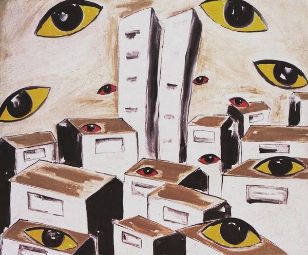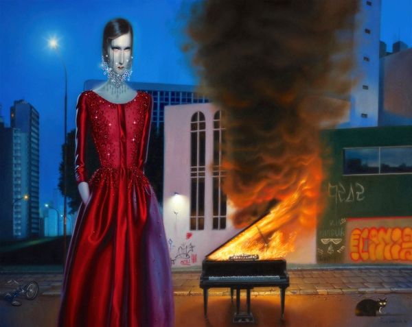 René Magritte's painting presents us with a stark, surreal landscape dominated by a monumental figure. A man in a business suit is facing a burning pyre in the distance. The figure’s head has been replaced by an enormous eye. The unsettling juxtaposition of familiar and bizarre elements is typical of Magritte. The color palette is muted, dominated by grays and soft blues. The texture of the sky is smooth, in contrast to the rough, stone wall on the right. The burning pyre introduces a disruptive element of warmth and chaos. Magritte challenges our understanding of identity and perception. The eye symbolizes sight, knowledge, and surveillance, while the faceless man in a suit suggests anonymity and conformity. How does the single eye destabilize established meanings, values, or categories? This painting reminds us that art invites us to question our assumptions and engage with multiple interpretations, rather than settling on any single meaning.