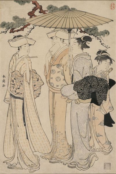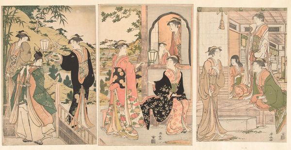 This diptych was made by Katsukawa Shunchō using woodblock printing, a process known as *ukiyo-e*, or “pictures of the floating world.” The *ukiyo-e* tradition involved a division of labor: the artist created the original design, which was then meticulously carved into woodblocks by specialist artisans. Separate blocks were required for each color, and these were printed in sequence to create the final image. The flat planes of color, sharp lines, and stylized forms are all characteristic of this medium, so different from painting. The materiality of the woodblock itself also contributes to the overall aesthetic. Notice the subtle grain patterns and slight imperfections, which add a sense of texture and depth to the image. These prints were made for mass consumption, and sold at relatively low prices. *Ukiyo-e* became popular because the woodblock technique allowed for images to be reproduced quickly and efficiently, fulfilling a growing demand from an increasingly literate and urban population. They weren't considered "high art" at the time; instead, they were affordable commodities circulated in a rapidly expanding economy. By understanding the materials, making, and context of *ukiyo-e*, we can fully appreciate its significance, and challenge traditional distinctions between art and craft.