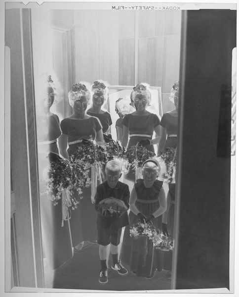 Curator: This intriguing vintage photograph, simply titled "Untitled (babies looking out window)" by Lucian and Mary Brown, captures a candid moment. Editor: It’s ghostly, isn’t it? The stark monochrome and the composition create this strange intimacy, like we're intruding on a private world. Curator: The window acts as a frame within a frame, doesn’t it? Windows often symbolize transitions, boundaries between inner and outer worlds, and the hopes and fears associated with the unknown. Editor: Right. And the textures are fascinating! Look at the patterned wallpaper, the sleekness of the glass, juxtaposed with the soft skin of the children. It's all about material contrasts. I wonder about the photographic paper used; its specific characteristics would inform the final image so much. Curator: Absolutely. And the babies looking out, their wide-eyed wonder reflecting in the glass… it speaks to a universal longing for what lies beyond our immediate grasp. Editor: For me, it’s a study of surfaces, literally and figuratively. The surface of the photograph, the surface of the window, the surface of childhood. It really makes you consider the processes of image-making. Curator: A poignant meditation on innocence and curiosity. Editor: And a powerful reminder of the materiality embedded within every image.