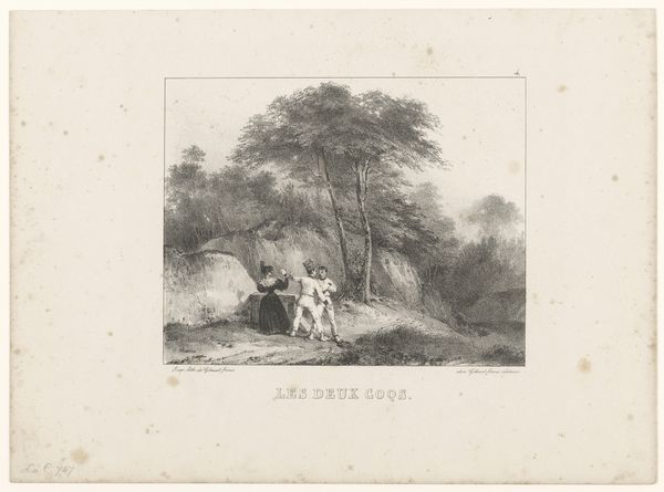 Curator: This is "Spaanse bandiet toont zijn metgezellen een gehangene," or "Spanish bandit showing his companions a hanged man," an 1832 etching by Nicolas Toussaint Charlet, currently held at the Rijksmuseum. Editor: The most immediate thing that strikes me is the stark contrast between the tranquility of the natural setting and the gruesomeness of the hanging. It’s deeply unsettling. Curator: Absolutely. Charlet’s work often grapples with themes of social upheaval and injustice, deeply entrenched within specific socio-political contexts of the Romantic era. It also speaks volumes about systems of power, where life and death are determined extrajudicially, far removed from democratic principles or legal frameworks. Editor: It’s compelling how Charlet utilizes Romanticism's visual vocabulary to deliver a scathing critique. The hanged man himself, though central, isn't overly emphasized. He’s a symbol, part of a broader visual language, a memento mori for the bandits, but also perhaps a warning about the instability of their own power. Curator: It also forces us to examine the role of the viewer, complicit in the spectacle. It echoes critiques of similar depictions across different eras – lynchings in America, executions throughout the French Revolution… Editor: Looking closer, the bandit pointing towards the body possesses a complex symbolic charge. He isn’t merely directing attention but also transmitting something...perhaps it's bravado, warning, or perhaps something darker, an assertion of control over fate itself. Curator: A terrifying proposition. It's also critical to acknowledge that such visual depictions contribute to desensitization, normalizing violence. We have to remain critical when encountering them and ask crucial questions. Who does it serve? Who does it marginalize or harm? Editor: Indeed, visual narratives are never neutral; they subtly—or not so subtly— shape perception. This piece reveals how symbols, even within romantic landscapes, become implicated in reinforcing power dynamics. It is quite haunting. Curator: This artwork certainly encourages that kind of nuanced interpretation. Its symbolic density lingers long after viewing. Editor: A stark reminder of the convergence of landscape and mortality, lawlessness, and romantic ideals. Very thought-provoking.