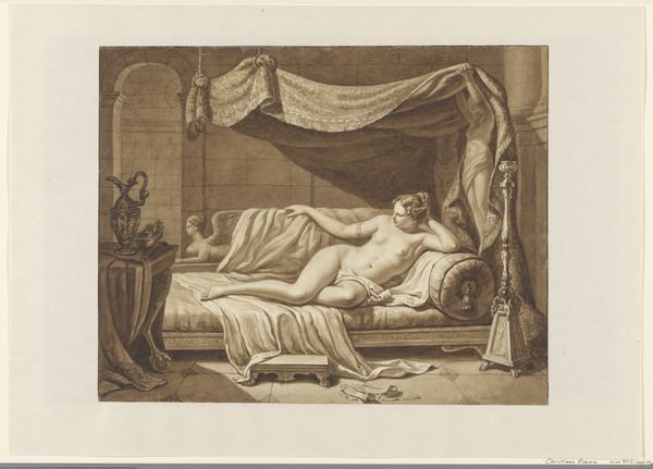 Henricus Franciscus Wiertz made this watercolor, ink and pencil drawing of a classical scene sometime before 1858. The artist has used thin washes of watercolor to create the forms. He hasn't tried to disguise the paper's tooth, leaving it to show through in places. This gives the artwork a fresh and immediate feel. But don’t be fooled: he also uses delicate contour lines to define the edges of forms. This process is very time-consuming and meticulous, requiring great skill and control, especially with a fluid medium like watercolor. Weirtz carefully builds up tone and shade to give a sense of three-dimensionality. Look, for example, at the way he describes the folds of the figures' garments. There's a wonderful contrast between the flowing robes and the precisely drawn, almost architectural, bed frame. The scene feels both timeless and somehow caught in a specific moment. Considering both material and processes when viewing art allows us to acknowledge and value the artist's skill, effort, and artistic choices, challenging traditional distinctions between fine art and craft.