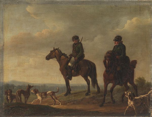 Curator: This is "Officer with Horse," a piece some attribute to the Dutch Golden Age painter Aelbert Cuyp, though the attribution remains uncertain. Painted with oils, it presents a glimpse into a past landscape. What are your initial impressions? Editor: Earthy, wouldn't you say? That umber and ochre palette feels like old leather and a kind of quiet contemplation. There's a softness too—not just the hazy ruins in the background, but also how the officer rests his hand on the horse. Curator: It certainly evokes a sense of serenity. This painterly quality that blends portraiture, genre painting and landscape together may tell us a great deal. The image presents a cultural and societal tension. Editor: A tension? Tell me more! Because on the surface, it seems pretty chill, doesn't it? A man, his horse, some cows...rustic idyll, perhaps? Curator: Indeed. The relaxed composition, though, almost clashes with the military garb and steed which carry significant symbolism, historically speaking. Think of power, control, perhaps even impending conflict, set against a peaceful backdrop of grazing cattle—domestic tranquility literally at the officer's back. Editor: Oh, I like that juxtaposition. It's not just about aesthetics then, but about visual storytelling, this negotiation of power and peace. Curator: Exactly. Consider how these images functioned: The gentleman presents an identity rooted in the physical reality but there’s cultural memory inscribed within, telling a more comprehensive story of societal values. Editor: You know, looking again, the cows do seem to have a smugness about them, as if they know something the officer doesn’t! This has me hooked, delving into such an image; you know, just seeing beyond the initial "brownness" of it all. Curator: That contrast is precisely where its intrigue lies! It shows, if anything, that seeing isn't always believing! There are other readings beneath its surface. Editor: Indeed!