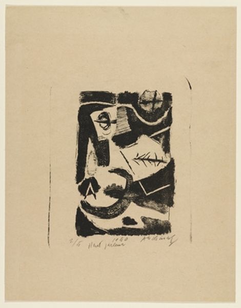 Curator: Let’s turn our attention to Paul Gauguin's woodcut print, "Woman Picking Fruit and Oviri," created between 1895 and 1896. Editor: My first impression is… powerful. Almost oppressive, the high contrast and densely packed figures create an intense, unsettling mood. It’s stark, graphic, and feels deliberately unsettling. Curator: Gauguin was deeply engaged with the politics of imagery, particularly around his representations of Polynesian women. How did his positioning as a European artist shape the narratives he constructed around these subjects? Editor: Exactly. Consider the title – it yokes together a mundane act with "Oviri," a Tahitian god associated with mourning and death. Gauguin exoticizes Polynesian culture, drawing from a potent mix of mythology and observed life but often through a lens of colonial power dynamics and sexual objectification. Curator: Woodcut was a key medium through which these representations circulated and became accessible to a broader public. We should keep in mind how Gauguin purposefully fashioned himself as a sort of untutored artist aligned with so-called "primitive" cultures. This aligns with his critiques of industrial society. Editor: It's a constructed primitivism though, and very loaded with contemporary European anxieties around civilization and the feminine. The dark, brooding figures definitely speak to the anxiety of that era, one also dominated by figures such as Nietzche and Freud. It’s as much about what Europeans thought of themselves as what they imagined Tahiti to be. Curator: And, if we examine its exhibition history, this print and others like it gained prominence through both commercial galleries and academic shows, cementing Gauguin's place in the canon while simultaneously circulating simplified and potentially harmful portrayals. Editor: I’m left considering what is revealed and what remains concealed through Gauguin's particular visual language. How can we engage critically with the beauty while remaining alert to the complexities of its context? Curator: An essential question. Reflecting on the layers of history within a work—from creation to its life in galleries—opens deeper understandings and possibilities of decolonizing our interpretations of it.