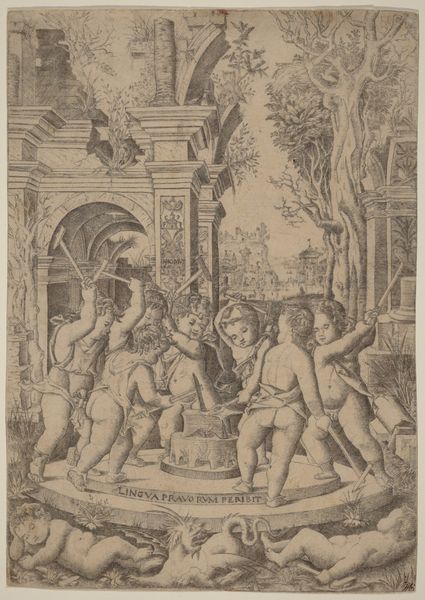 Editor: Here we have a print, an engraving actually, by Marcantonio Raimondi, made between 1505 and 1515, titled “A young man sitting at right resting his head in his hand, a snake with a woman's head before him, a young woman holding a pan pipes standing in the centre and a young man leaving at left.” It's incredibly detailed, and the figures are so precisely rendered. It gives the scene a very still and posed quality. What do you see in this piece, Professor? Curator: Considering Raimondi’s historical context and engraving techniques, I see a fascinating convergence of artistic skill and societal influence. The linear precision achieved through engraving reflects not just aesthetic preferences, but a material engagement. Engraving demanded particular tools, laborious processes, and a trained hand, differentiating it from freer forms of drawing. How might this emphasis on technical process and dissemination challenge traditional views on artistic value during the Renaissance? Editor: That’s a very interesting take. I hadn't thought about the act of reproduction and dissemination. Curator: Indeed. This work would be available to a wider audience, rather than sequestered to one collector. Think about how the materials—the ink, the paper, the copperplate—facilitated the distribution of knowledge and aesthetics during the Renaissance. Could this ease of access and spread challenge traditional boundaries between ‘high art’ and a broader visual culture? Editor: I suppose it democratizes it. I was thinking more about the narrative scene and trying to understand what it might mean, but now I’m much more interested in who had access to it. Curator: Exactly. And who controlled the means of production and consumption of these images? The focus should move beyond symbolic readings alone. Examining who bought, sold, and copied the engraving can provide vital context. Editor: Thanks, I hadn't thought about art from this material perspective. I am keen to do so going forward.