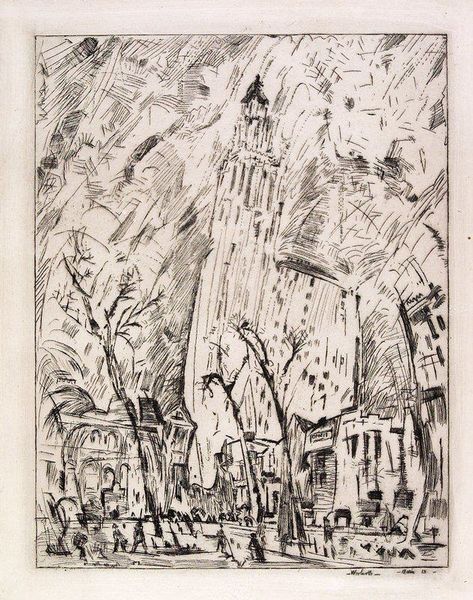 Ernst Ludwig Kirchner rendered this print of the Frankfurter Dom with rough, expressive lines that dominate the composition. The scene is a flurry of marks, creating a sense of unease and dynamism rather than a stable, picturesque view. The print's structure reveals Kirchner's expressionist interest in conveying emotional intensity through form. The use of jagged, almost violent lines destabilizes any sense of traditional perspective, immersing the viewer in a chaotic representation of urban space. The contrasts between light and shadow are stark, heightening the emotional impact and disrupting conventional expectations of harmony and balance. By avoiding clear, descriptive details, Kirchner challenges the viewer to actively engage with the artwork. The distorted representation of the cathedral suggests a critique of established social and religious structures, typical of the Expressionist movement's rejection of bourgeois values. In this way, the print is not just a depiction but an act of questioning and reinterpretation.