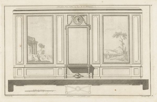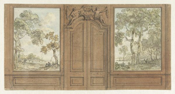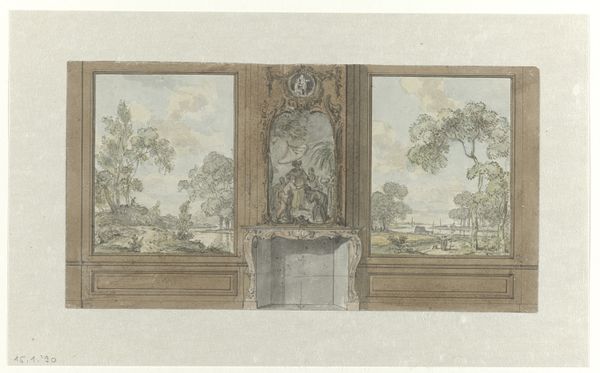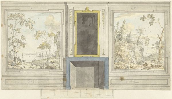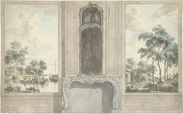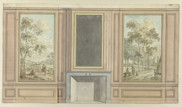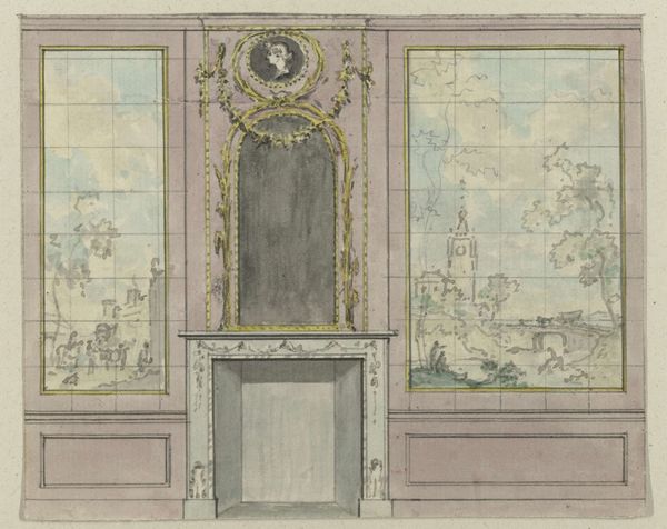 Editor: This drawing, "Ontwerp voor kamerwand," or "Design for a Wall Decoration," by Jurriaan Andriessen, dates from around 1752 to 1819. It's ink and tempera on paper. The landscapes either side of the fireplace really catch my eye; they feel so serene, like idealized visions of nature. What kind of imagery strikes you in this piece? Curator: For me, this work is saturated with the visual language of Neoclassicism, a movement deeply invested in cultural memory. Notice the architectural follies – the rotunda and the temple – embedded within these idyllic landscapes. They're not just decorative; they're loaded symbols of classical antiquity, representing a longing for a perceived golden age of reason, order, and harmony. Editor: So, it's more than just pretty scenery; the placement of those buildings signifies something deeper? Curator: Precisely! The artist is consciously evoking a connection to the past. Look closely at the figures populating these scenes – they’re almost archetypal, like figures in a classical frieze, enacting timeless rituals within a carefully constructed pastoral setting. Consider how the central mirror, adorned with laurel wreaths, functions as a focal point, reflecting the viewer and, metaphorically, their own relationship to this idealized vision. Does the muted palette evoke a specific mood for you? Editor: It feels quite calming. And the mirror does bring you into the scene somehow. I guess I never really thought about how even a design sketch could be so packed with meaning. Curator: Indeed. By understanding the symbolic vocabulary employed here, we gain a richer appreciation of the cultural values and aspirations of the period. Editor: I see it now. It's about invoking the past to inform the present, building layers of association through these symbols. Thanks for pointing all that out!