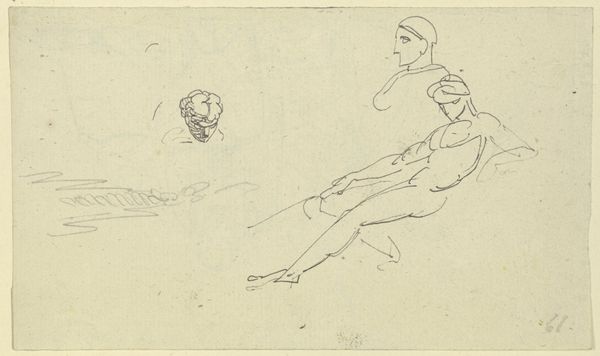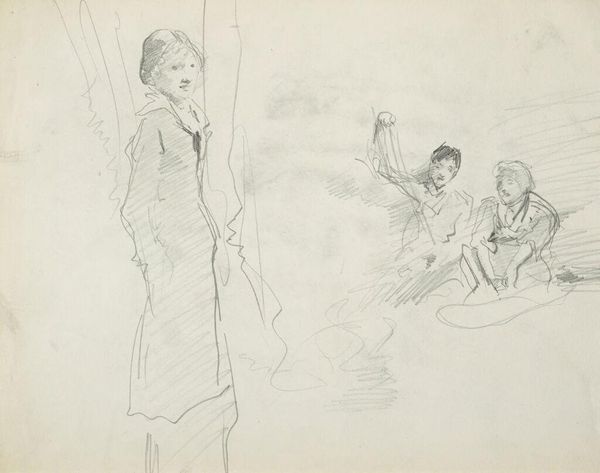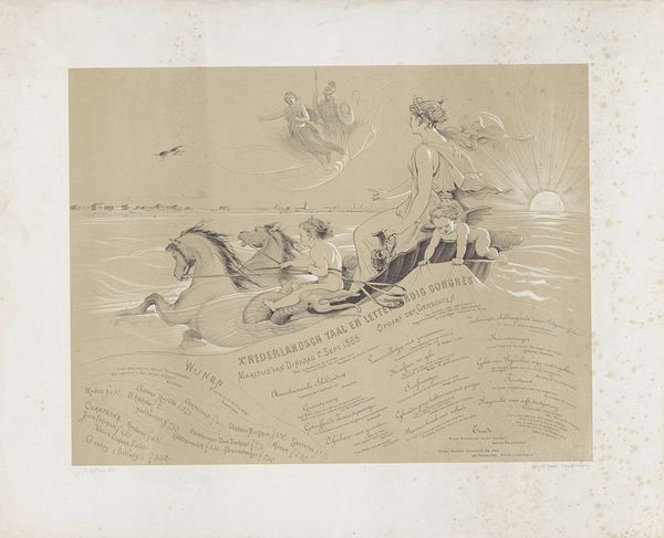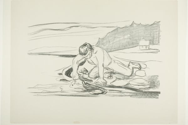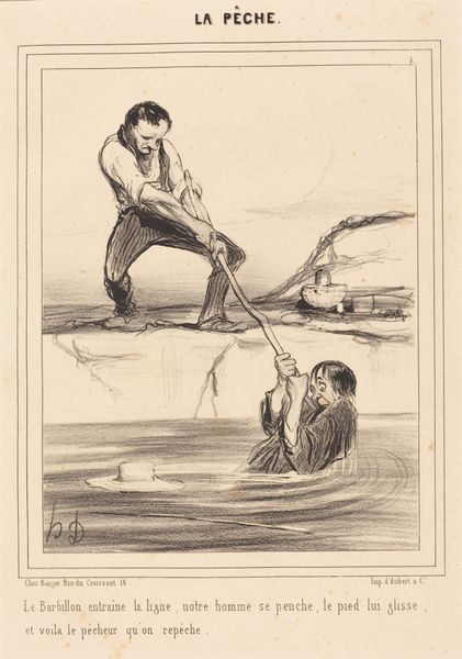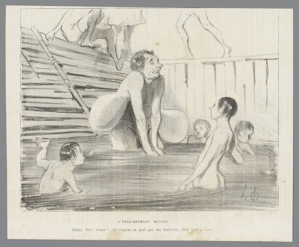 Editor: This lithograph, titled "Attention, Gargouillet, v'la le bourgeois qui passe..." by Honoré Daumier, dates back to 1842. The scene captures people bathing in what seems to be a public area. I am really struck by the expressive lines, and how effectively they portray movement, and how effectively the medium suggests something comedic! What aspects of the formal construction of this print do you find most compelling? Curator: Indeed. Focusing solely on the visual composition, consider the strategic placement of the figures. Observe how Daumier uses a shallow depth of field. Our attention is immediately drawn to the foreground and middle ground where the majority of visual information resides. Editor: Right, I see it! The figures almost seem to push forward toward us! Curator: Precisely. Note the limited tonal range within the print. Daumier masterfully exploits the potential of lithography to establish contrast. We can see the effect achieved through varied densities of line work. How might that affect the viewing experience? Editor: The stark contrasts make certain areas—like the splashing water and the faces—pop. I suppose the composition and tonal values work to draw the eye. I also notice the quick, sketchy lines give a sense of immediacy, a snapshot quality. It almost seems raw, in a way, yet conveys so much emotion and movement. Curator: I find your assessment accurate. By carefully analyzing Daumier’s stylistic choices—the linearity and spatial relationships within the artwork—one may then explore its visual power. This allows for a greater understanding of Daumier's particular manipulation of medium. Editor: I hadn't considered the limited depth of field, nor how the medium accentuates tonal contrast! That has completely transformed my understanding of this piece. Thanks!