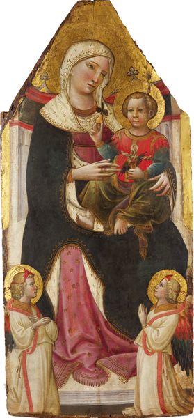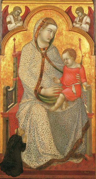 Editor: Here we have Cimabue's "Madonna Enthroned with the Child and Two Angels," a tempera painting from around 1280. I’m struck by the strong vertical composition and the contrast between the flat, gold background and the attempts at realistic shading on the figures. What draws your eye in this piece? Curator: The structure dictates everything. Note the strict symmetry and the hierarchical scaling, placing Madonna at the apex. Observe how the lines of the architecture beneath her direct our gaze upwards. How do these formal choices contribute to the overall reading of the work, in your estimation? Editor: Well, the symmetry definitely creates a sense of order and importance, highlighting the Madonna's central role. The upward direction draws my eye and elevates her position. Curator: Precisely. Consider the deliberate use of gold. It flattens the pictorial space, denying depth, and asserting the painting as a constructed object rather than an illusionistic window. What semiotic readings might the gold invite? Editor: I guess the gold evokes divinity and timelessness, setting this scene outside of earthly concerns. Curator: Indeed. Reflect on how Cimabue orchestrates these elements—line, color, symmetry—to construct a visual language of faith and power, a language far more enduring than fleeting naturalism. How would you summarize Cimabue's project? Editor: It's fascinating how he balances Byzantine traditions with a move towards Renaissance naturalism using compositional devices like symmetry and selective depth. It really makes me appreciate the painting as a designed object meant to convey symbolic meaning. Curator: I find myself in agreement. A work that demands attentive viewing, not for its representation, but its calculated presentation.