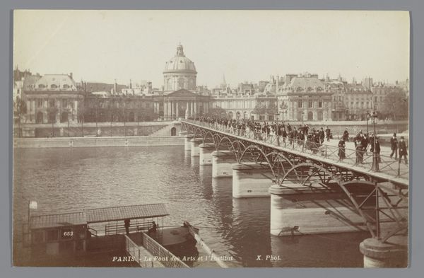Albert Mansuy captured this photograph, "View of the Palais de l'Institut and the Pont des Arts over the Seine in Paris", using a monochrome process. The muted sepia tones and soft focus lend the image a timeless quality, evoking a sense of nostalgia. The composition is structured around the horizontal expanse of the Seine, bisecting the image and creating a tranquil foreground that contrasts with the architectural details in the background. The Palais de l'Institut, with its prominent dome, punctuates the skyline, establishing a focal point that draws the eye upwards. Mansuy has arranged the image to create depth and perspective, using the bridge to lead the eye into the city, hinting at the bustling life beyond the frame. The photograph invites contemplation on the relationship between permanence and transience, structure and fluidity. The image captures a moment in time, yet the scene remains enduring.