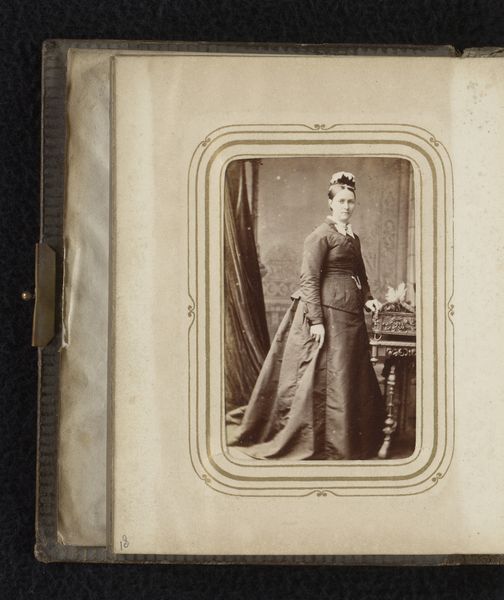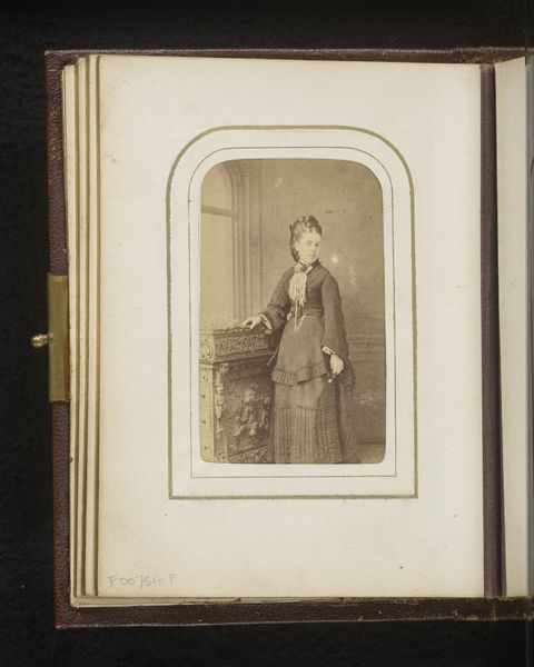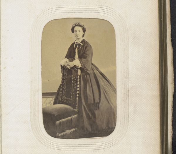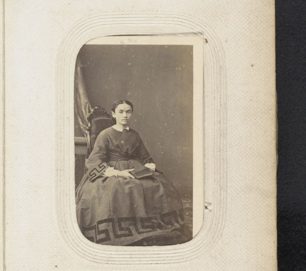 Editor: This is "Portret van een meisje, staand bij een fauteuil," a photograph from between 1878 and 1889. There’s something really haunting about the image’s subdued tones and the girl’s stoic pose. What do you see when you look at this piece? Curator: Formally, the image strikes me with its controlled arrangement of light and shadow. Observe how the artist directs our gaze through strategic tonal contrasts. The dark dress of the subject plays against the diffused, lighter background. Editor: I notice the backdrop. Does its pattern contribute to the overall composition? Curator: Indeed. The backdrop introduces a secondary plane of detail, albeit intentionally blurred. This soft contrast enhances the sharpness of the girl's figure, setting off the geometry of her clothing against the softness of her skin. How does the chair's structure strike you? Editor: It adds another layer of texture. The curves offer a contrast to the straight lines of her attire and posture, but is that enough to resolve the disjunction of forms? I’m still uncertain. Curator: The visual "disjunction", as you call it, creates a dynamic tension, doesn’t it? It underscores the photographic nature of the image itself--the act of freezing an unrepeatable arrangement of forms in space. It emphasizes the artwork's structure, inviting us to reflect on form beyond its immediate representative function. Editor: So, it’s the arrangement of shapes and tones, not just the representation, that gives it power. I’ll definitely be considering that dynamic more carefully from now on. Curator: Precisely. Understanding how an image presents itself structurally offers the means to deeper insights.