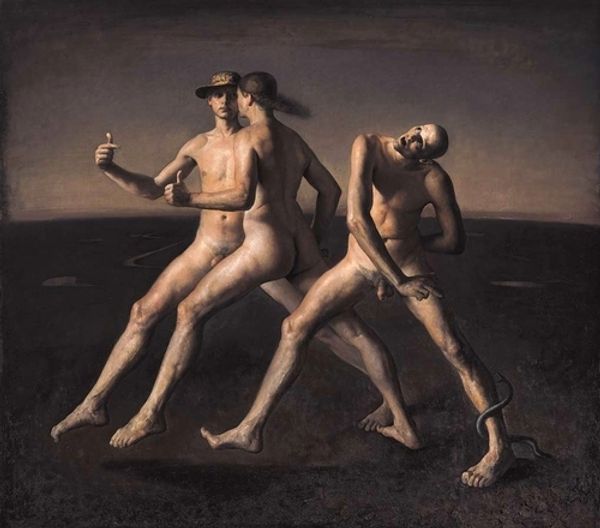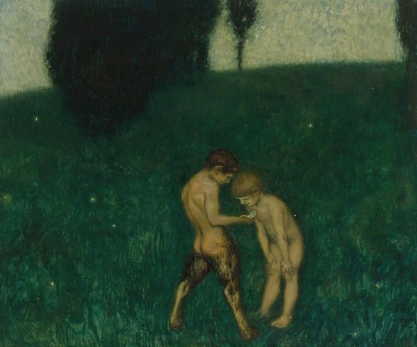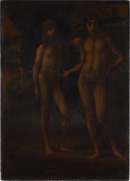 Franz von Stuck made this painting, Adam and Eve, at the beginning of the 20th Century using oil on canvas. What strikes me is the odd color palette, which feels both heightened and muted. The figures emerge from a field of velvety darkness, their forms created with thin layers of pigment. I see how the subtle gradations in tone and texture create a luminous effect, like they’re lit from within. Look at the snake - that rich, iridescent blue is gorgeous against the pale flesh tones. The brushwork in the snake is soft and blended, but in places the paint is built up, creating a tangible sense of weight and form. It makes me wonder if Stuck was influenced by artists like Gustave Moreau, who were also exploring these themes of symbolism and decadence. Anyway, it’s easy to get hung up on the narrative, but I think the real power of this piece lies in its ambiguity. You know, what is being communicated here? Stuck leaves it open to interpretation, letting the materiality of the paint do the talking.