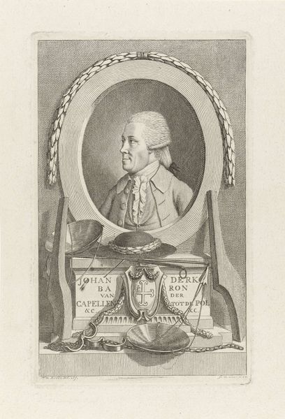 Editor: We’re looking at a print entitled *Portret van Károly Ferenc Palma* by Johann Ernst Mansfeld, created before 1796. It appears to be an engraving, quite detailed. The subject seems rather austere; it definitely has a Baroque sensibility in the ornate depiction and tight composition. What strikes you most about its form? Curator: The formal qualities of this engraving present an intriguing visual structure. Observe the carefully constructed composition: the portrait within a circle, superimposed upon the rectangular frame. The circular frame itself seems to both contain and elevate the subject, setting off visual resonances with its surroundings. How might you describe the textural contrasts achieved solely through line work? Editor: Well, there’s a sharp difference in texture between the smooth face of the subject and the drapery behind him. The lines used to render the fabric are much more dense and varied. How do those decisions guide your eye? Curator: Precisely! Note how the density of lines creates a sense of depth and shadow, further accentuating the face of Károly. This strategic deployment of line directs our focus, constructing a visual hierarchy that draws attention to specific areas, imbuing them with greater visual importance. Have you considered how the lettering interacts with the portrait itself? Editor: I see it acts as a sort of pedestal, framing the lower portion. It grounds the image, providing a visual anchor. What is its significance to the formal reading of the print? Curator: In Formalist terms, consider how the lettering occupies space, balancing the overall design. It's not merely text, but a cluster of dark lines and shapes balancing the shading around the portrait and enriching the picture plane. This demonstrates an appreciation for the overall arrangement and impact that transcends any immediate semantic content. Editor: So the relationship between line, texture, and shape creates meaning, even beyond what the subject itself represents. It provides another layer through which to engage. Thanks, I'll definitely look more closely at engravings from this angle going forward. Curator: Indeed. Attending to these inherent structures provides profound insights into the work itself.