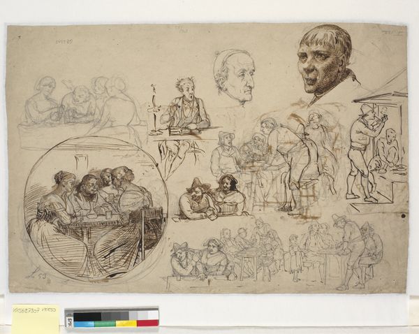 This sheet of paper holds a collection of sketches by Wilhelm Marstrand. With graphite, Marstrand brings together angels, satyrs, portraits, and other figures in a seemingly random arrangement. The composition is fragmented, lacking a central focus. Each sketch exists independently, yet they share the same plane, creating a visual field where disparate elements coexist. The rapid, gestural lines suggest spontaneity, capturing fleeting ideas as they come. We can interpret this lack of traditional composition as a challenge to established artistic conventions. The disarray suggests a deeper engagement with the fluidity of thought. Marstrand invites us to abandon fixed meanings and embrace the multiplicity of interpretation. The act of sketching, the layering of images, becomes a performance of thought itself, where the artwork is not just an object, but a process.
